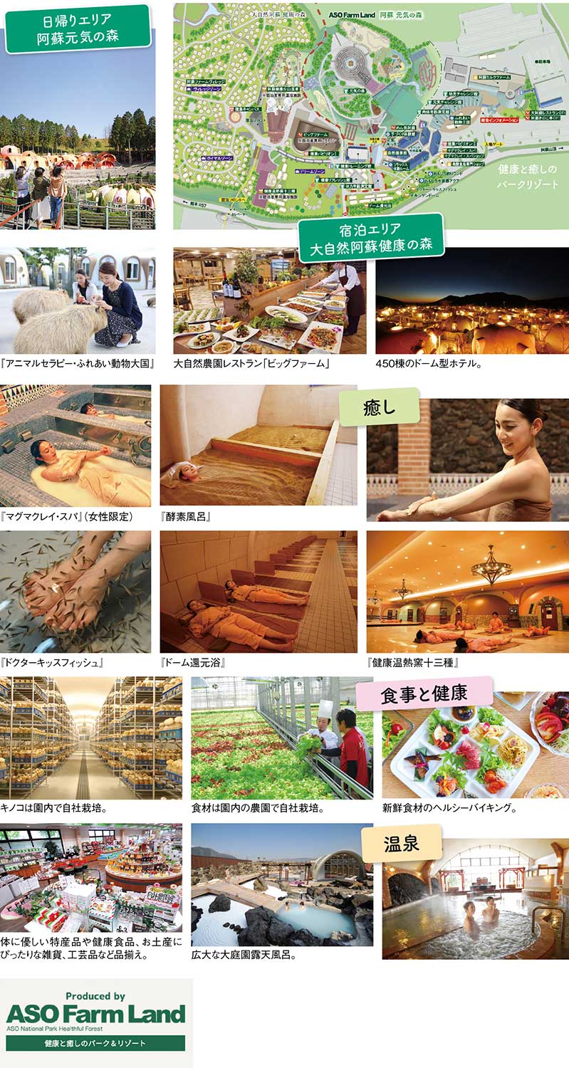 熊本県・阿蘇の雄大な自然に抱かれるように佇む『大自然阿蘇健康の森&阿蘇元気の森』は、心と身体の両方を整えられる唯一無二のウェルネスリゾート。阿蘇くじゅう国立公園内の約100万㎡という広大な敷地の中で宿泊エリアと日帰りエリアで構成。どちらのエリアも運動・食事・癒やし・宿泊・体験・学びを通し、楽しみながら健康の大切さや素晴らしさを実感できる場所だ。男女それぞれ約1000坪を誇るビッグスケールの温泉施設は、源泉100%循環かけ流しの阿蘇健康火山温泉。15種類もの多彩なスタイルで楽しむことができる。また、ここにしかない唯一の大型スパ施設が『健康温熱窯十三種』。薬草や岩塩など自然素材に包まれた13種類の温熱窯が並び、入浴着着用のため、カップルや家族で一緒にリフレッシュできる。女性限定の泥スパ『マグマクレイ・スパ』やデトックス効果抜群、発酵の力を活かした『酵素風呂』、抗酸化還元理論に基づいて開発された今までにない健康温浴療法『ドーム還元浴』など、温浴施設だけでも驚くほどの充実ぶり。温浴施設でスッキリした身体には、阿蘇の大自然の恵みを存分に味わえるヘルシーバイキングで栄養をチャージ。管理栄養士監修のもと、自社農園で無農薬栽培された野菜をたっぷり使った身体にやさしく栄養価の高い料理が並ぶ。宿泊は、森の中に点在する離れタイプのドーム型ホテル。角のない丸い空間は、母親の胎内に包まれているかのような安心感を与えてくれる。澄んだ空気と静寂の中で深く眠り、自然のリズムに身を委ねる時間は、日常では得がたい贅沢な休息となる。日帰りエリアの『阿蘇元気の森』には、アスレチックや運動施設、カピバラなどの動物と触れ合えるエリア、ジェルキャンドルやオルゴールの手作り体験施設など子どもから大人まで楽しめるコンテンツが揃う。健康や癒しに関するグッズや発酵食品、阿蘇ならではの特産品が並ぶショップも充実。