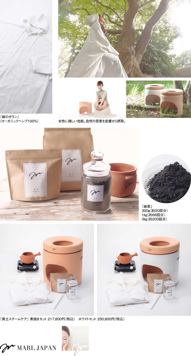 『MARL JAPAN株式会社』では、日本六古窯の一つとして有名な地で、家庭でもできる本格的な「よもぎ蒸し」一式セットを手作りし、販売している。日本全国を駆け巡り、約3年の年月をかけて誕生させた至高のアイテムだ。本体に使用するのは、純国産黄土100%。黄土には人間の体にとって大切な鉄分と有機物が豊富に含まれる。多量の遠赤外線が放出するので、麻草を煮出すと、磁器や土鍋などに比べ、約80倍もの違いがあるという。さらに黄土は、体内から不純物などを引き寄せる力があり、デトックス効果も高めてくれる。