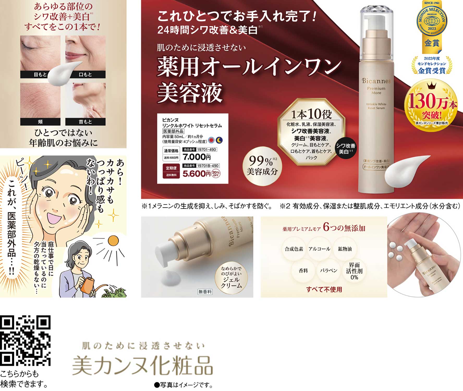 『美カンヌ化粧品』の『ビカンヌ リンクルホワイト リセットセラム』は、洗顔後これ一本でスキンケアが完了する薬用オールインワン美容液。独自に提唱する「浸透させない肌理論」に基づき、有効成分を角質層にとどめることで、保湿力が続き、じっくり肌へ働きかける。有効成分ナイアシンアミドを配合し、シワ改善と美白の両方を同時にサポート。さらに、加水分解コラーゲンや水溶性コラーゲン、ヒアルロン酸、植物由来エキスなどを贅沢に配合し、うるおいとハリ、透明感のある肌へ導く。