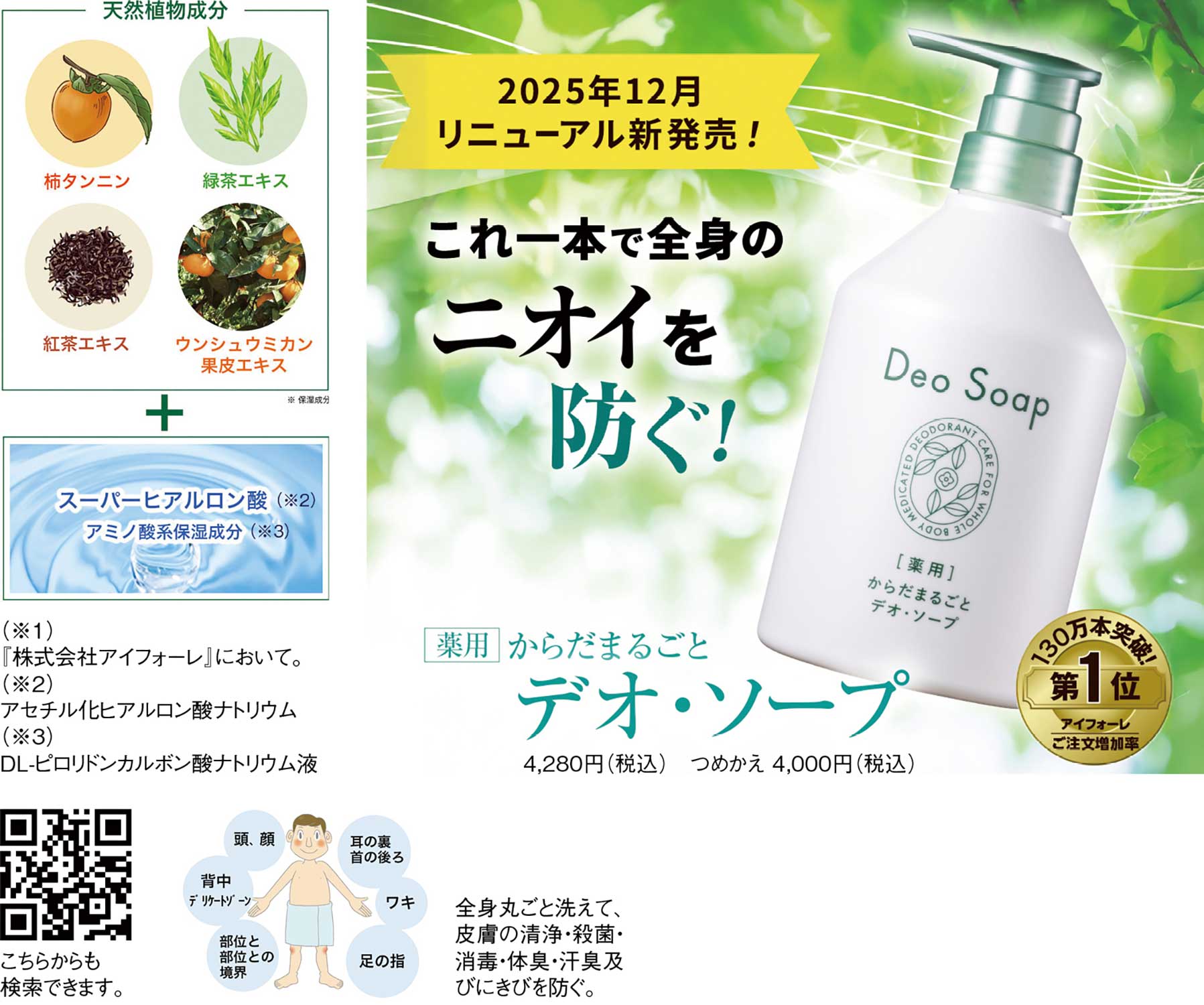 『薬用からだまるごとデオ・ソープ』は、『株式会社アイフォーレ』が展開する医薬部外品の薬用ボディソープ。1本で頭から足の指先まで全身まるごと洗える設計で、気になる汗や皮脂のニオイの元を根本からケアする。累計販売130万本を突破した人気商品で、性別・年代を問わず家族全員で使えるのが特長だ。有効成分のイソプロピルメチルフェノールが、雑菌の増殖を抑え殺菌・消毒し、ニオイをしっかり洗い流してくれる。豊かな泡立ちで汚れに密着し、シトラスフローラルのほのかな香りが日々のバスタイムを心地よく演出。リニューアルにより消臭力・泡立ち・保湿感が向上し、洗い上がりはさっぱり爽快でしっとりなめらかな肌に仕上がる。毎日の習慣として体臭ケアを取り入れることで、汗臭や加齢臭など様々なニオイ悩みを軽減し、清潔感のある毎日をサポート。男女問わず、日常のニオイ対策にオススメの薬用ボディソープだ。