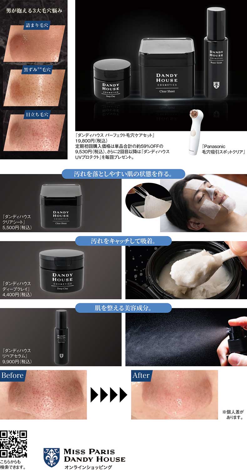 日本のメンズエステを牽引する『ダンディハウス』から誕生したのが「週1~2回、約10分、簡単4ステップ」(デイリーケアは3ステップ)で、エステ並の毛穴ケアが完了する『ダンディハウス パーフェクト毛穴ケアセット』。詰まり、黒ずみ※1、開きをトータルでケアする3点セットだ。