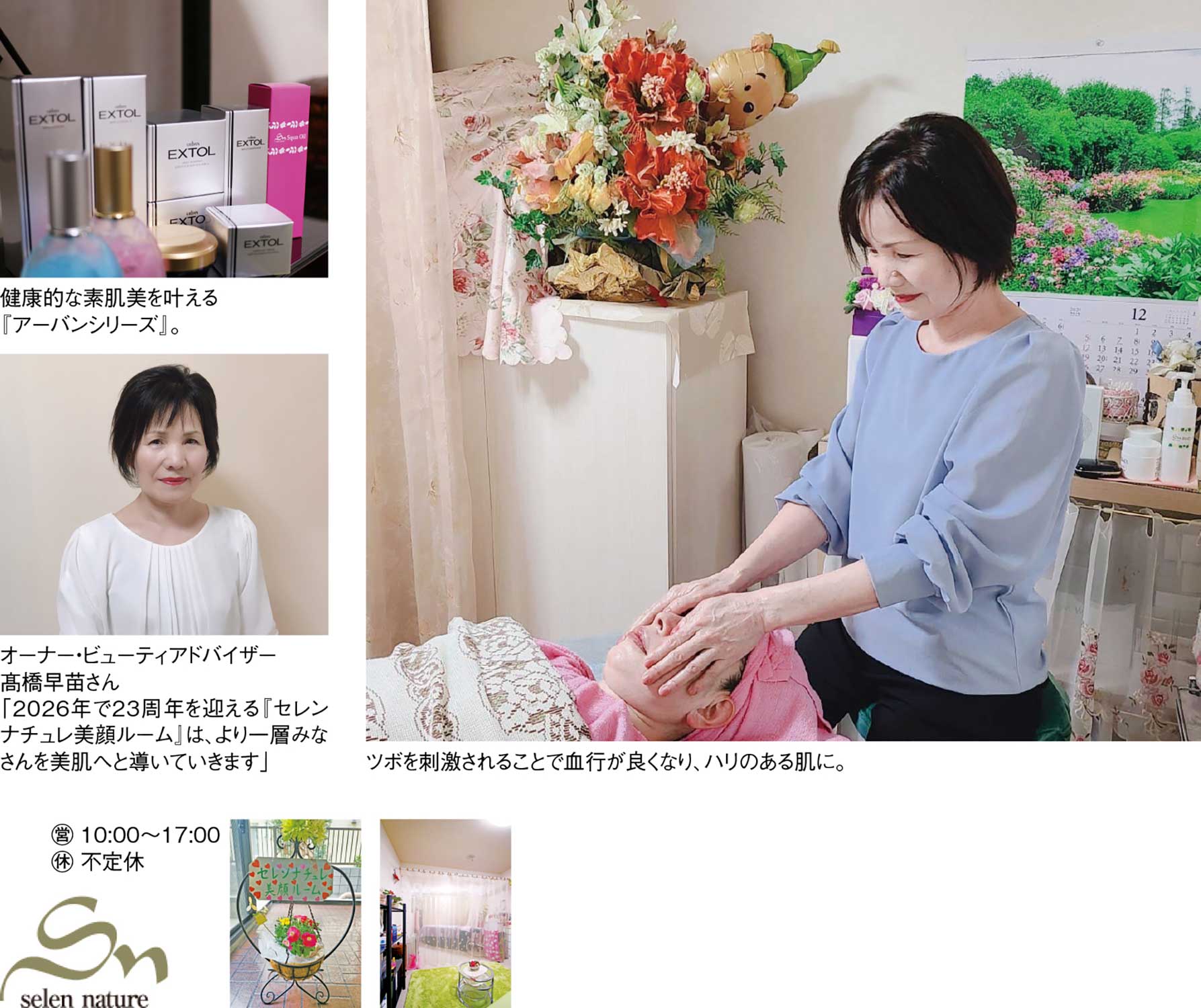 まるで隠れ家のような落ち着いた空間。東洋の知恵を活かしたオールハンド施術で、心もお肌もリフレッシュできると人気の完全予約制サロン『セレンナチュレ美顔ルーム』。オーナー兼ビューティーアドバイザーの髙橋早苗さんの30年以上にわたる確かな経験と経絡やツボを意識したリズムのある穏やかな手技で深いリラックスへと導く。年齢と共に変化するお肌の状態に寄り添いながら、それぞれの悩みに合わせたきめ細やかなケアで肌本来の持っている健やかな肌を引き出せるよう、丁寧にアプローチしている。