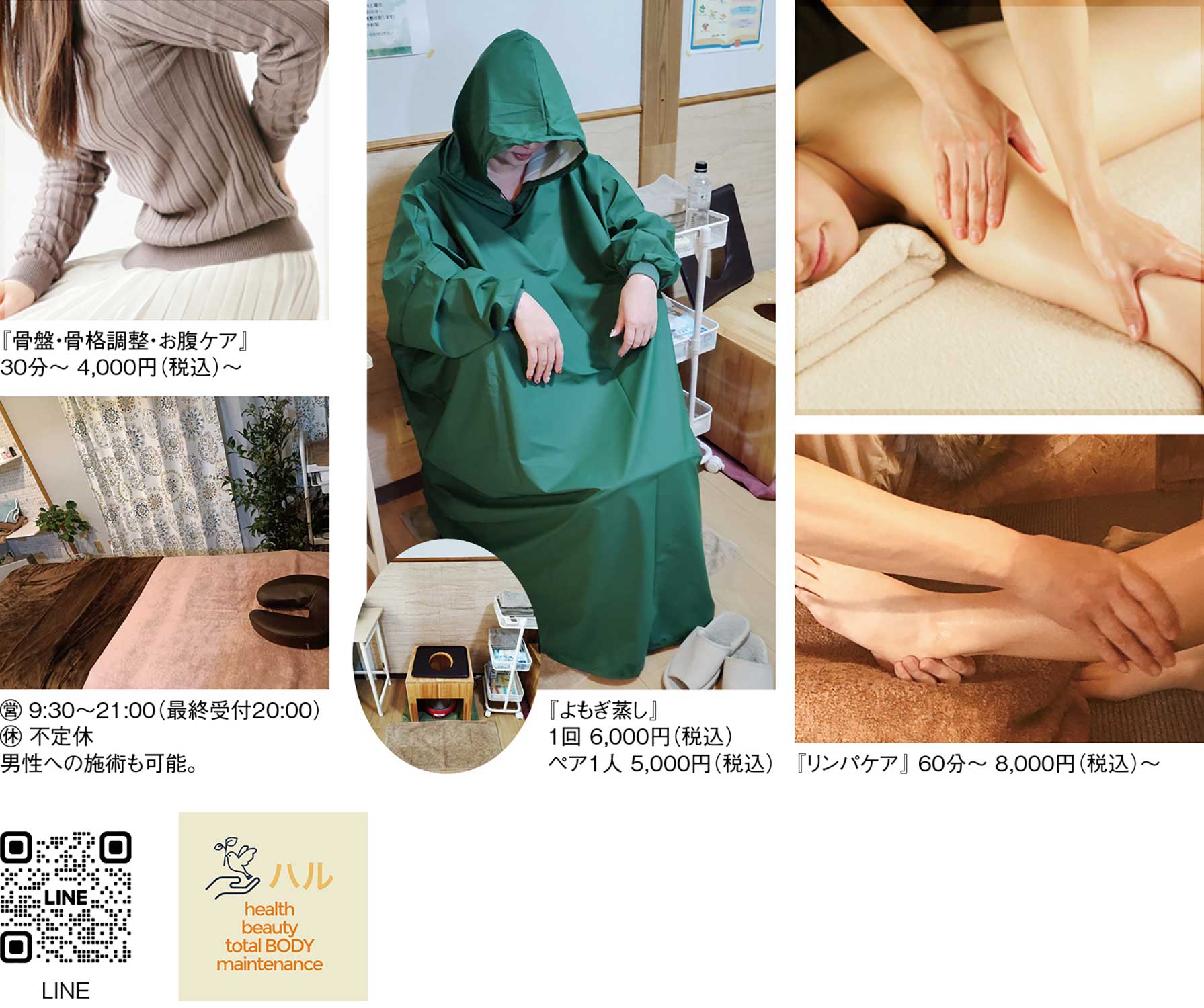 神奈川県川崎市、武蔵新城駅から徒歩約1分の『totalBODYmaintenance Salon ハル』は、『リンパドレナージュ』や『骨格調整』『よもぎ蒸し』など多彩な施術をオーダーメイドで組み立てるプライベートサロン。身体の不調の原因を丁寧に見極め、施術後の過ごし方などのアフターケアまで含め、寄り添ったサポートを行う。通うたびに身体の変化を実感できるとして評判だ。近年注目される『フェムケア』にも対応。女性特有の身体の悩みやライフステージに寄り添い、デリケートゾーンを含む骨盤周りや内臓環境、自律神経のバランスを整えることで、冷え・生理不順・更年期症状・尿もれ・ホルモンバランスの乱れなどの不調改善を目指す。心身の健やかさを土台から支える。伝統的なお腹のケア『チネイザン』は、様々な分野の智慧と技術を融合させたオリジナルの内臓(五臓)の揉みほぐし。便秘・胃もたれ・生理不順など幅広い症状に効果を発揮する。『よもぎ蒸し』では、身体を内部からじっくり温め、体温上昇や新陳代謝促進、冷え性改善、免疫力向上が期待できる。オールハンドで行う『リンパケア』では、全身をしっかり流して心も体もデトックス。
