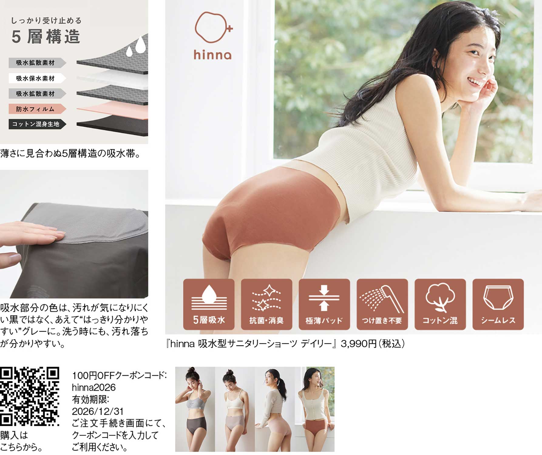 「株式会社エル・ローズ」フェムケアブランド『hinna』の『吸水型サニタリーショーツ デイリー』は、従来の吸水ショーツが抱えていた「分厚い」「お手入れが大変」といったイメージを根本から見直し、プロダクトとしての快適性を徹底的に磨き上げたシリーズだ。ショーツ本体も吸水部も極限までミニマム化し、目指したのは普通のシームレスショーツのようなヌーディな着用感。柔らかな綿混生地が縫い目のない構造で身体に沿い、日常の動きを邪魔しない。吸水パッドは5層構造を採用し、素早い吸収と長時間のサラッと感を両立。機能性と軽やかさを同時に成立させる設計は、まさに究極の吸水ショーツの形といえる。さらに、シャワーを当てるだけで汚れが落ちやすい素材を使い、お手入れの負担も軽減。使い捨てに頼らないことで、身軽さと環境配慮の両方を叶えている。ふつうのショーツと変わらない着心地で気負わず選べる、日常に自然と溶け込む新しい選択肢だ。