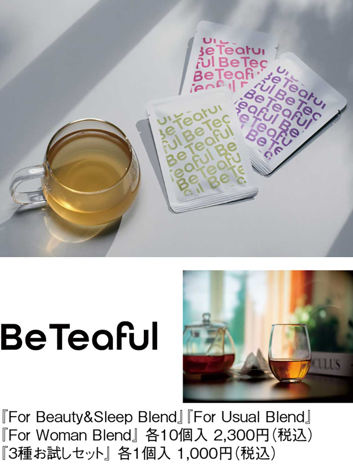 『Be Teaful』のハーブティーは、産婦人科医がクリニックや病院以外でも女性を応援したいと考案した商品。浮腫みや便秘、アンチエイジング、肌荒れに効果があるもの、更年期症状や生理痛の緩和に役立つもの、女性ホルモンのバランスを整えデトックス効果のあるものなど三種類が販売されている。すべてノンカフェインにこだわり、日々の生活に無理なく取り入れられる優しい味わいも魅力の一つだ。ハーブで毎日元気に。