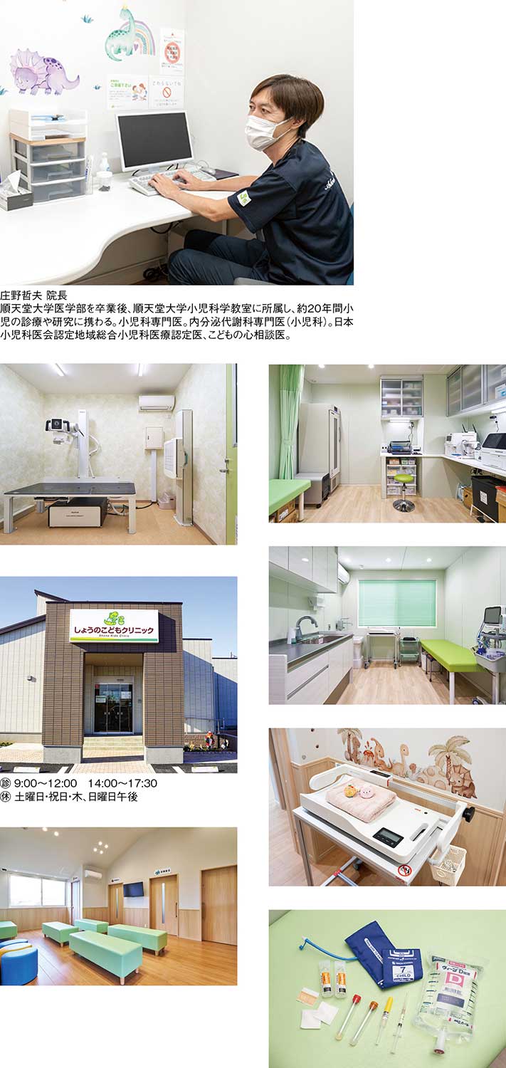大人と子どもでは、同じ病気であっても症状のあらわれ方や程度が異なる。子ども特有の病気や症状、身体の構造を熟知しており、子どもの発達段階や成長過程、精神面などの問題を踏まえたうえで幅広い視点から診察をしている。小児急性期外来では、突然の発熱や咳、嘔吐、発疹、腹痛などの症状に対し、速やかに診断・処置を行う。気管支喘息などの基礎疾患をお持ちの場合は、風邪などをきっかけに発作が起きたり、急激に症状が悪化したりすることがあるため、そうした急変にも柔軟に対応できる体制を整えている。小児内分泌科では、低身長や思春期の問題、肥満といったホルモンが関与する幅広い相談に対応。人体は様々なホルモンバランスが何らかの原因で崩れると病気を引き起こしてしまうことがある。低身長では、現在の身長だけでなく、体重や生まれてから今までの経過も含めて判断する。思春期が周囲よりも早くはじまったり逆になかなか始まらなかったりする場合には、ホルモンのバランスや発達の状況を丁寧に診察し、必要に応じて検査や治療を行う。小児肥満では、本人の食生活の乱れや運動不足だけでなく、肥満を引き起こす疾患が隠れていたり、家族の生活習慣やストレス、睡眠不足などが原因となっていることもある。肥満の放置は、2型糖尿病や高血圧、脂肪肝などの健康リスクだけでなく、自己評価の低下やいじめの原因になることもあるので、バランスのとれた食生活を意識し、定期的な運動、十分な睡眠やストレスをためない生活といった生活習慣の改善が大切となる。小児アレルギー科では、乳児期の湿疹、アトピー性皮膚炎、食物アレルギー、喘息、アレルギー性鼻炎、アレルギー性結膜炎など免疫の過剰反応による疾患に対して症状の背景を丁寧に探りながら、生活指導と治療の両面から支援する。小児のアレルギーは、年齢によって発症しやすい疾患が異なり、成長によりアレルギー疾患が改善することもあれば、様々なアレルギー疾患が年齢によって次々と発症することもある。アレルギーにできるだけ早く気づき、原因となるアレルギー物質の除去や症状軽減のための薬物療法、アレルギー性の炎症を抑えるための長期的な薬物療法を行う。アレルギーという病気を理解し、根気よく治療を継続することが重要だ。小児皮膚科では、乳児脂漏性皮膚炎やアトピー性皮膚炎、じんましん、手足口病、とびひ(伝染性膿痂疹)、みずいぼ(伝染性軟属腫)といった小児の皮膚疾患に対し、適切な薬剤の処方やスキンケアの指導を通して、治療を行っている。発達相談外来では、注意欠如・多動症や自閉スペクトラム症、限局性学習症、発達性強調運動症、知的能力障害などの神経発達症の相談・診断にも対応。友人関係がうまく築けない、一人で遊んでいることが多い、空気が読めない、こだわりが強い、忘れ物が多い、教室の中で動き回ってしまうといった悩みに対し、状況や環境を踏まえ、時には薬の力も借りながら親子ともに幸せを感じながら生きていけるように支援する。また、予防接種では厚生労働省が推奨する接種間隔に基づいた接種スケジュールを自動で組めるシステムを導入し、院長がワクチン接種を行っている。院長をはじめ看護師や受付医療クラークといった医療スタッフは、小児科での勤務経験が豊富で子どもの扱いに慣れたスタッフが揃っているのも大きな特長。子どもが病院を怖がらないよう、パーカーやスクラブで診療することを心掛けており、声のトーンや距離の取り方、タイミング、姿勢、表情などにも配慮しながら診察や検査、処置を行う。保護者にもわかりやすく伝えることを心掛ける。院内スタッフの多くは、庄野院長と以前から一緒に過ごしてきたメンバーが中心。風通しがよく、意見交換をしやすい空気感を大切にしている。今後は右腕となる医師を迎え、さらに医療体制の充実を図ることも検討している。