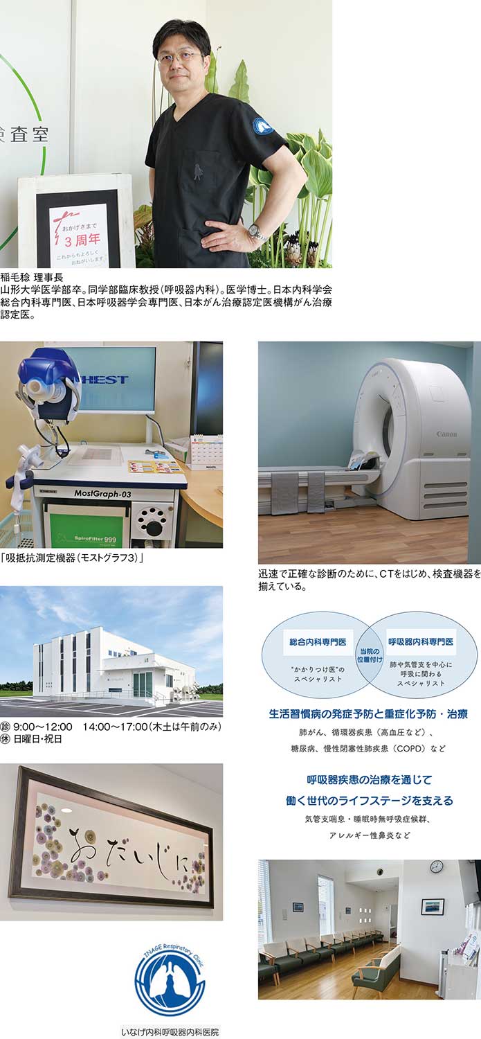 山形県東置賜郡の『医療法人社団いなげ内科呼吸器科内科医院』は、呼吸器内科の専門医院と総合内科専門医院の中間に属する位置づけの町のかかりつけ医院。肺がん、循環器疾患(高血圧など)、糖尿病、慢性閉塞性肺疾患(COPD)、気管支喘息・睡眠時無呼吸症候群、アレルギー性鼻炎などに特化した予防・治療に力を入れている。高齢者はもちろん、中高生の来院も多く、家族全員で通っているというケースが多い。現在1ヵ月の来院数は1500名を超え、午前9時スタートの外来は、診察待ちの列ができるため前倒しで開院することもあるという。