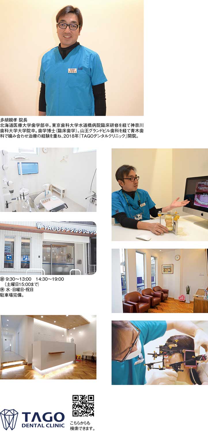 埼玉県戸田市の『TAGOデンタルクリニック』では、噛み合わせの歪みに着目し、科学根拠に基づいた専門的な歯科治療でお口全体の健康を維持するためのサポートを行っている。多胡親孝院長は、噛み合わせをテーマにした研究で臨床歯学博士の学位を取得し、15年近くこの分野に深く携わってきた経験と豊富な知識をもとに、従来の予防歯科にとどまらないアプローチを実践しているプロフェッショナルドクターだ。