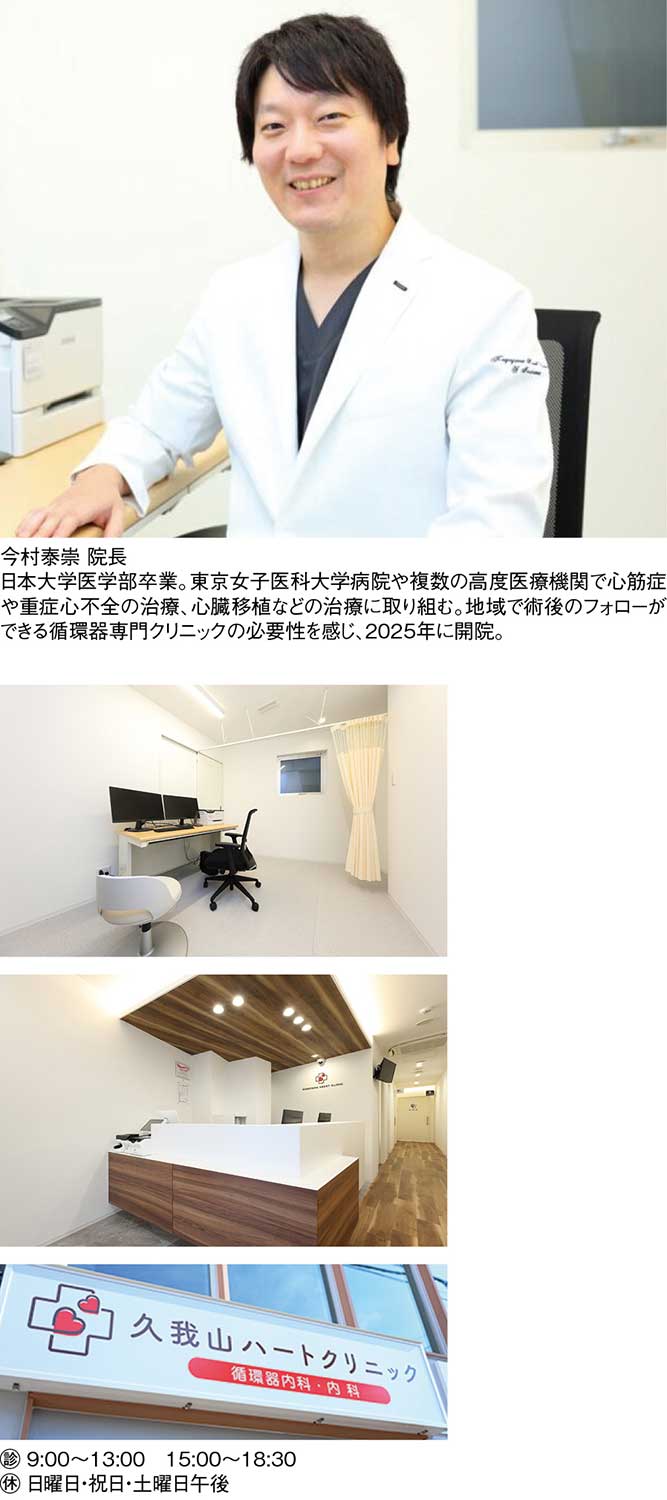 『久我山ハートクリニック』では、心臓や血管などの循環器疾患や高血圧、脂質異常症、糖尿病などの生活習慣病の予防や治療に特化した専門性の高い医療を提供している。今村泰崇院長は、東京女子医科大学病院をはじめとする高度医療機関で経験を重ね、循環器専門医として豊富な臨床実績を持つ。長年過ごしてきた杉並区の地域の方と深く向き合い、病気の予防や早期発見・早期治療、術後のフォローアップに努めたいと考え、2025年に開院した。以来、心臓病や血管疾患の診断・治療はもちろん、予防医療や健康管理に力を注ぐ。同クリニックでは、血液検査や尿検査、心電図、24時間ホルター心電図、負荷心電図、超音波検査、レントゲン、ABI/PWV検査など、検査設備が充実しているのも大きな特長。その場で診断や治療方針の決定が可能なので、早い段階から適切な治療が開始できる。心臓や血管の病気は、生活習慣病の管理や予防と密接に関係している。定期的な検査や早期発見・早期治療を通して、いつまでも健やかに過ごせるように寄り添っている。