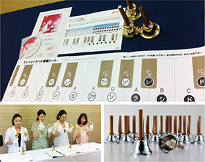 ピアノの鍵盤を模したシートにハンドベルを置いて音階をイメージできる 『ベルの鍵盤シート音域表』付属 |