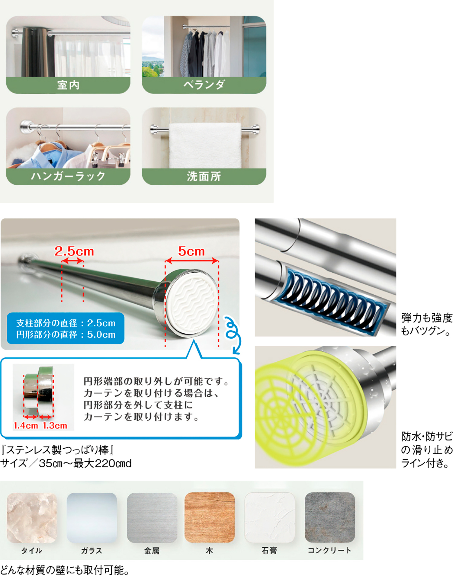 壁に設置する側面には、防水防サビの滑り止めラインが施されているので、浴室のタオル掛けや窓の吹き出し口などに設置することも可能。タイル、ガラス、木、石膏やコンクリートなどあらゆる素材の壁にもぴったり固定できる。「クローゼットが小さい」「デッドスペースを有効に使いたい」「部屋の仕切りにカーテンをつけたい」など様々な用途に大活躍するアイテム。2本使えば収納棚としても活用可能。