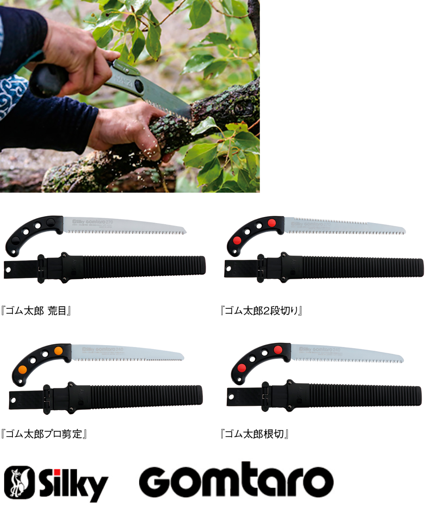 林業従事者や大工といったプロフェッショナルから、DIYや庭の手入れに使用するアマチュアまで、手に馴染むハンディなノコギリとして海外でも愛されている「シルキーブランド」の各種ノコギリ。 製造元の『株式会社ユーエム工業』は、刃物の町としてもしられている兵庫県小野市で1919年の創業以来、独自の技術と想像力でノコギリの切れ味、使いやすさを追求してきた。1984年には、世界ではじめてハンドルにゴムを採用したノコギリ『ゴム太郎』シリーズを発売、今なお多くの人々に支持されている。『ゴム太郎』は、ハンドルをゴム製にすることにより、剪定や枝打ち、型枠工事などの際、手に手袋・軍手をはめていたり汗をかいても滑りにくく、強く握り込まなくても力を逃がすことがないので100%引く力を刃に伝えることができる。また、刃に施した「アサリ無し鏡面研磨」により、スムーズに、また切断面も美しく仕上がる。折りたたみ式の『ゴムボーイ』シリーズも『ゴム太郎』同様、今や職人必携の道具といえる。
