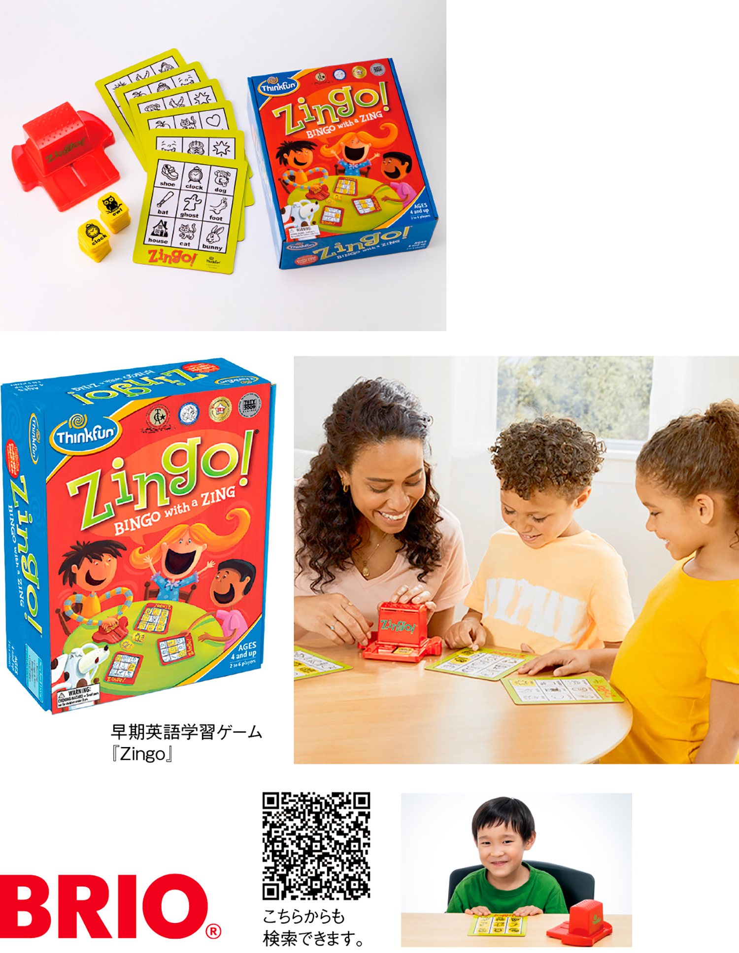 小学校で英語の授業が必修になった今、未就学児のうちから英語に慣れ親しむことは大事になっている。そんな中、アメリカで子ども大人も夢中になれる言葉遊びゲームが日本にも登場。日本では『ブリオジャパン株式会社』が取り扱うシンクファンの早期英語学習ゲーム『Zingo(ジンゴ)』。英語とビンゴゲームを融合したアクションゲーム。「ジンゴマシーン」と呼ばれる可動式のケースに英単語が書かれたタイルをセットし、「ジンゴマシーン」をスライドするとタイルが2枚ずつ出てくるので、プレイヤーは配布されたカードに同じ単語が書かれていたら、その英単語を素早く叫ぶ。一番早く叫んだ人がタイルを得ることができ、9マスを一番早く埋めることができた人が勝ちとなる。英単語には、それぞれイラストも付記されており、視覚的に理解できるので、英語に慣れていない子どもでも楽しく遊びながら学べるようになっている。また、数字だけでより簡単に楽しめる『ジンゴ1|2|3』や英会話でよく使う単語が入った『ジンゴ・サイトワード』もある。