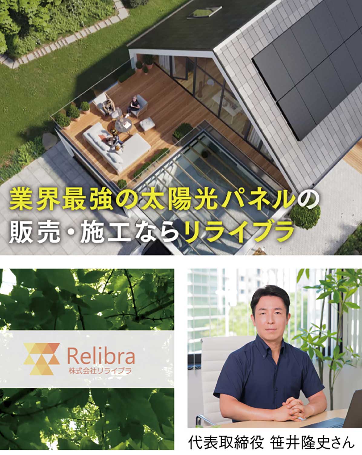 『株式会社リライブラ』は、太陽光パネルメーカーで事業責任者を務めた経験豊富なメンバーが代表を務める会社だ。パネルは主要メーカーを取り揃え、屋根形状、ライフスタイル、予算などを踏まえ、お客様目線の提案を行っている。いっさいの訪問販売を行わず、人件費などのコストを最小限に抑え、競争力のある価格を実現。長年携わってきた経験から高品質なサポート・アフターフォローを提供している。