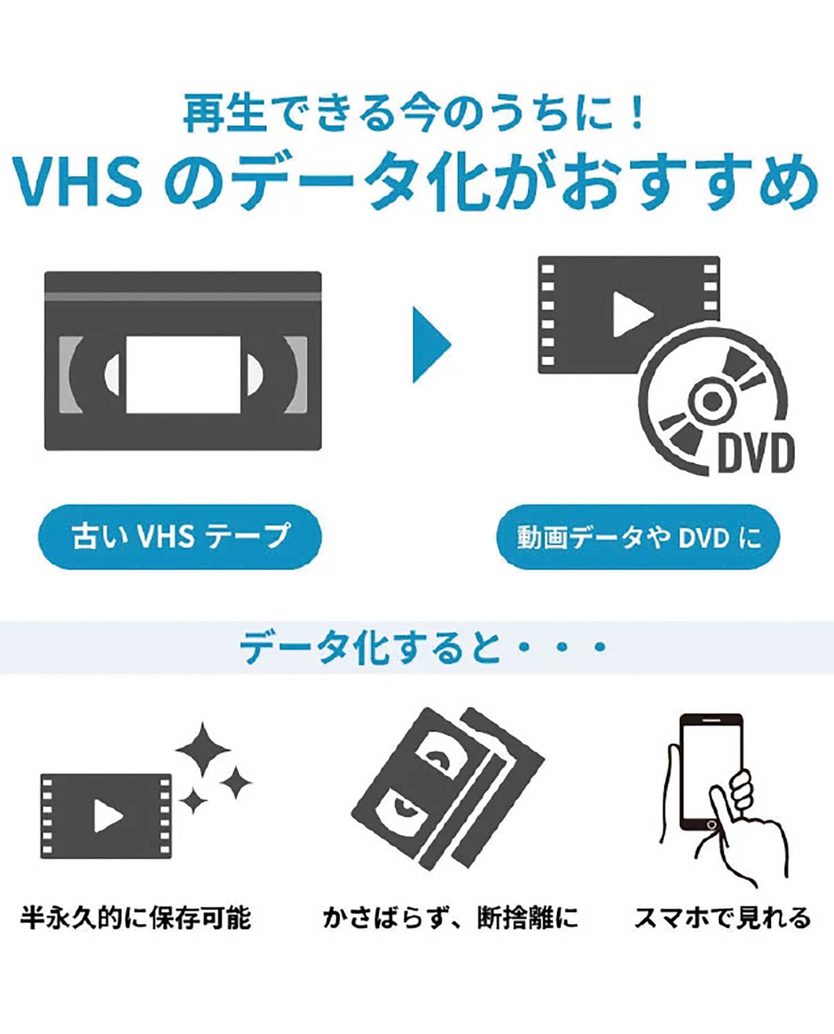 「VHS2025年問題」は、昭和から平成にかけての最盛期に作られ録画された多くのビデオテープが、劣化のために寿命を迎えて再生できなくなるというもの。『株式会社磁気研究所』ではVHSテープに残っている録画記録をDVDやブルーレイ、MP4といった現代のスタンダードな映像形式に落とし込む『VHS変換サービス』を行っている。かつてホームビデオで録った大切な思い出を残すならお早めに。