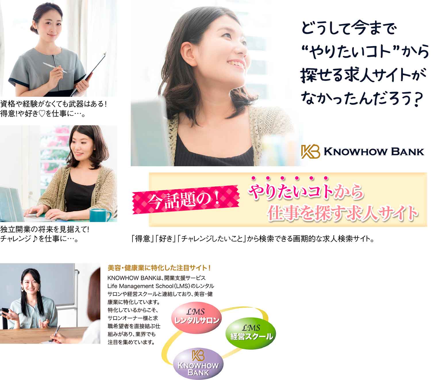 やりたいことで生きていくことが主流となりつつある昨今、美容・健康業界に画期的な求人検索システム『KNOWHOW BANK』が誕生した。同システムは、『株式会社ISACC』の開業支援サービス『LMS』のレンタルサロンや経営スクールと連結しており、職種・待遇はもちろん、「得意なこと」「好きなこと」「チャレンジしたいこと」から検索可能。サロン側で、従来の育成する人材確保ではなく、最初から問題を解決できる人財を確保しようとする動きが高まっている今、資格や経験が浅い方でも意欲や野望さえあれば、仕事のチャンスは無限大に。パソコンが得意、SNSが好き、接客に自信ありといった「得意なこと」「好きなこと」や、店舗運営をやってみたい、物販に挑戦したいといった「チャレンジしたいこと」など、スキルや経験以外の「+α」をアピールして、新しい人生への第一歩を踏み出そう。