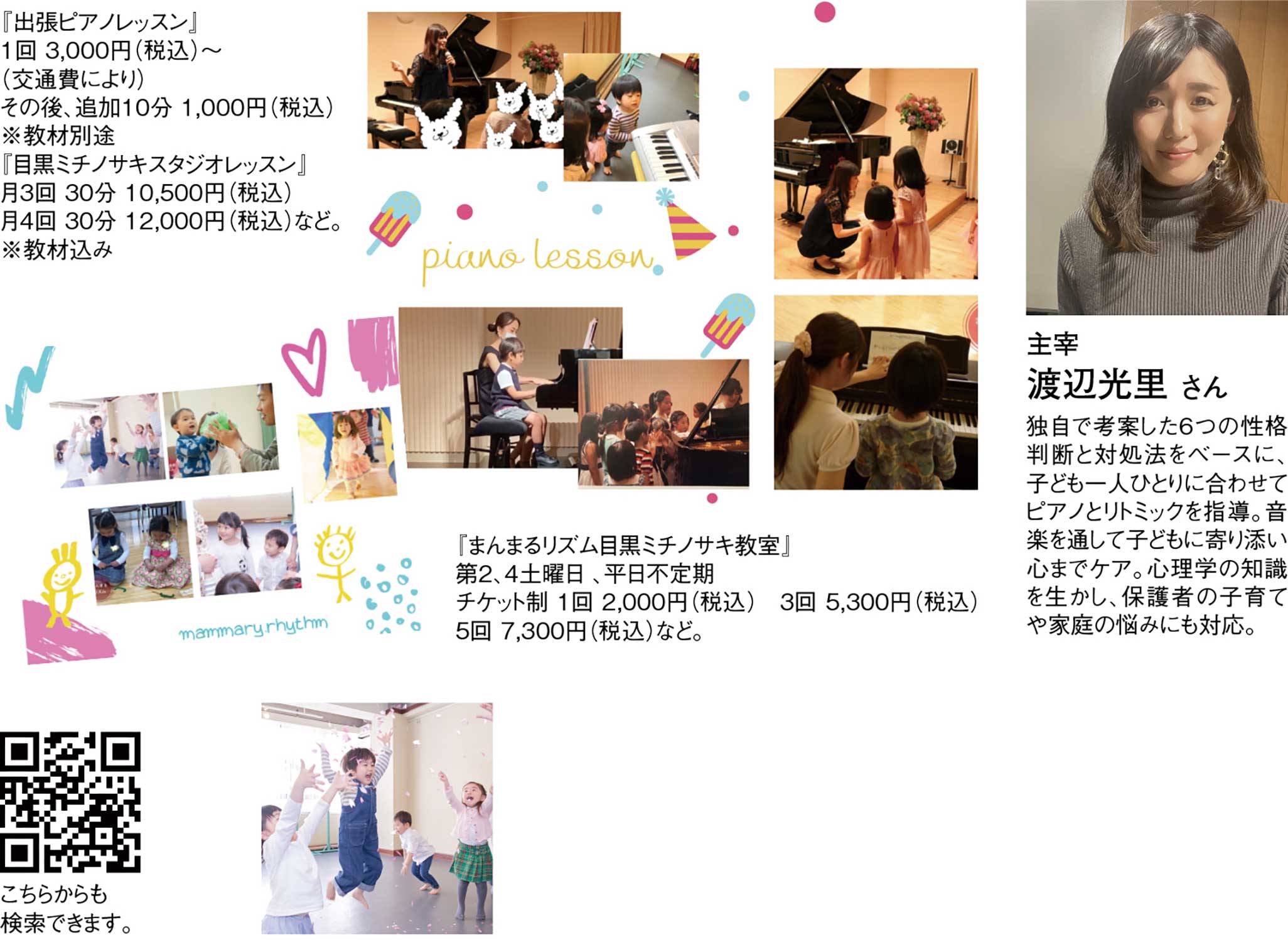 東京・目黒区、港区、渋谷区、世田谷区で、ピアノの出張レッスンを行う『ひかりピアノ』を主宰する渡辺光里さん。同教室が他教室と異なるのは、ピアノの演奏だけではなく、「メロディーを奏でるピアノや音楽に合わせて体を動かすリトミック」に力を入れていること。IQ、EQ(感情指数:感情を理解する力、良好な対人関係を築く力)、HQ(人間性知能:信念を持ち夢の実現する力)を育むといわれているピアノに心理学などを取り入れ、子どもたちと徹底的にコミュニケーションをとっていくレッスンでママたちの中で評判が広がっている。