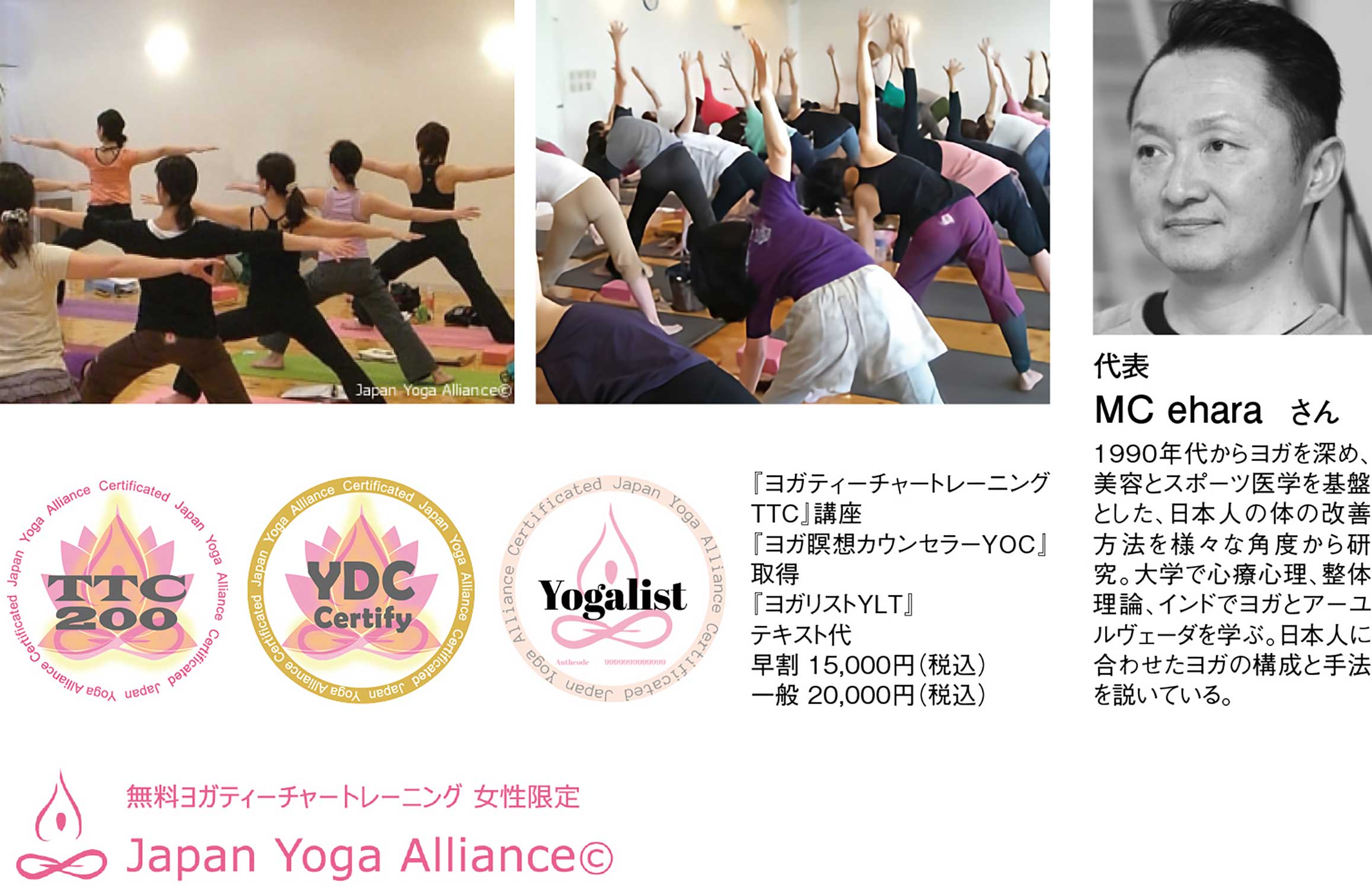 アンチエイジング、老化予防、メンタル的効果、老廃物除去、内側からの美容効果、体調改善、睡眠の向上など様々な効果のあるヨガ。MC eharaさんが代表を務め、ヨガの普及に務める『日本ヨガアライアンス協会ⓒ』では、3種類の資格認定講座を開講している。『ヨガティーチャートレーニングTTC』は、ヨガインストラクター養成コース。ヨガの基本的な知識、アーサナの方法、呼吸法を学ぶ。初心者も体が硬い方も、続けていくことで徐々に体が柔らかくなり、心も柔軟に。インストラクターになりたい方はもちろん、自分のために学ぶのもオススメだ。『ヨガ瞑想カウンセラーYDC』は、日本で唯一、瞑想を体系化した人気の資格習得コース。約10種類の瞑想手法が学べ、本格的な瞑想へ導くためのインストラクションも体得する。『ヨガリストYLT』は、美容サロンで行うアーユルヴェーダ・整体・パーソナルトレーニング・ヨガの食事療法を学び、美容のスペシャリストとして開業を目指すコース。無料出張授業の案内、学校や会社などへインストラクターを派遣してヨガを直接指導する 『出張授業』を行っている。