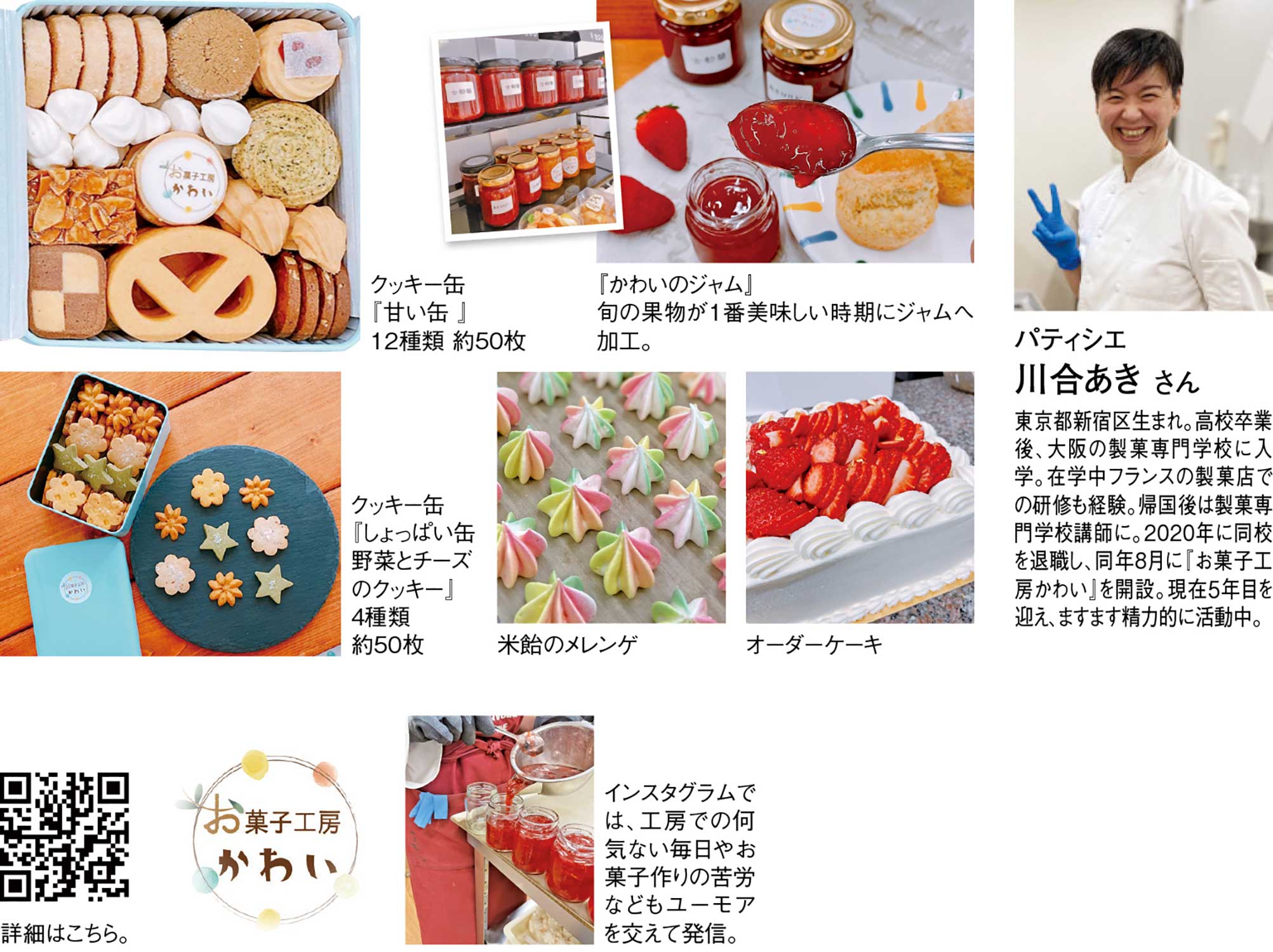 厳選された素材にこだわり、さらに味だけでなくパッケージや詰め方にも工夫を凝らした各種焼菓子をメインに、旬のフルーツから作る季節のフルーツジャムや世界でただ一つのオーダーケーキが人気。さらにはオリジナルのコラボ菓子を手掛けたり、地域イベントに参加するなど、お菓子を通じて地元に元気を、子どもたちに笑顔をと、幅広く活躍をみせているのが奈良県香芝市の『お菓子工房かわい』。ご主人と二人で切り盛りするこのお菓子工房のパティシエである川合あきさんは、有名製菓学校在学中にフランスへ留学して、卒業後もフランスで製菓を指導するなどの経歴を持つ。そうした豊富な見識を元に、お菓子についても幅広い視点を持ち、企業の商品プロデュースや各種イベント・セミナー、講演活動なども精力的に行っている。そんな川合さんから直接指導が受けられるレッスンが好評。お菓子作りを本気で学びたい方のための対面・オンラインによる毎月1回、約3時間のプレミアムレッスン。修了すればクッキー缶から基本生地、パウンドケーキなど『お菓子工房かわい』で販売しているのと同じ本格的洋菓子作りが自宅でも可能に。また、お店を開業したい人のためには、川合さんのノウハウが詰まった「ショップ開業講座」という座学レッスンも開講中。