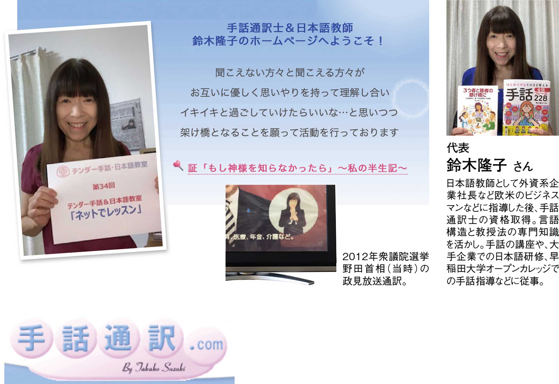 東京都三鷹市で、手話通訳士&日本語教師として『テンダー手話&日本語教室』を主宰する鈴木隆子さん。手話の講座や現在日本で唯一の「聴覚障がい者のための手話で行う日本語講座」を開催している。