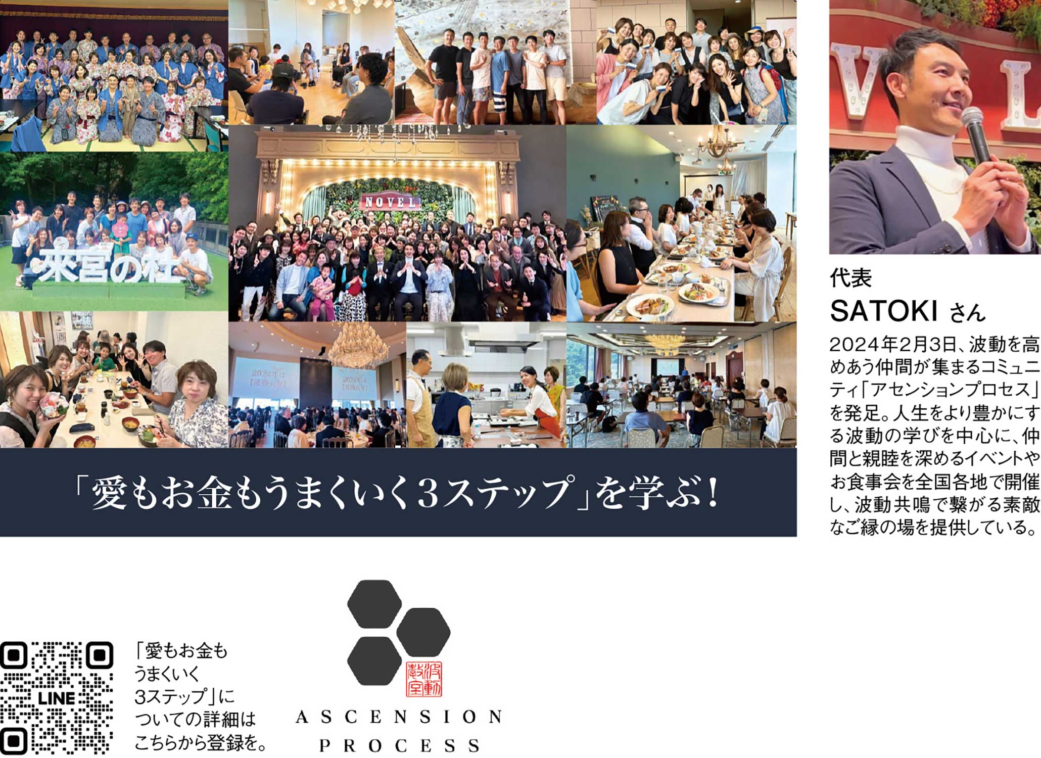 「もっと自分らしく生きたい」「より良い人間関係を育みたい」、そんな思いを抱いている方に紹介したいのが、「波動を高めあう」をコンセプトに全国各地で様々なイベントやセミナーを開催しているコミュニティ『アセンションプロセス』。集まるのは、「目に見えないものの大切さ」を学ぶビジネスパーソンやママさんなど精神性の高い仲間たち。波動を理解し、コントロールする知識と技術を学び活かすことで、より自分らしさを発揮し、人や社会に貢献する生き方や働き方を実現することができる。「人は今抱いている感情の周波数と同じ周波数の感情にさせられる現象が現実的に起こる」とされているのが波動の考え方。さらに、波動が同じものは引き寄せあうという法則もある。これが昨今話題になっている「引き寄せの法則」だ。つまり、波動の高い人といることで、波動は上がり、豊かで幸せに満ちた理想の人生を叶えられる。公式LINEに登録すると、「愛もお金もうまくいく3ステップ」について詳細を知ることができる。「波動とは?」「生まれ持った資質とは?」「風の時代の調和とは?」など、これからの時代に必要な情報を学べる勉強会も開催。