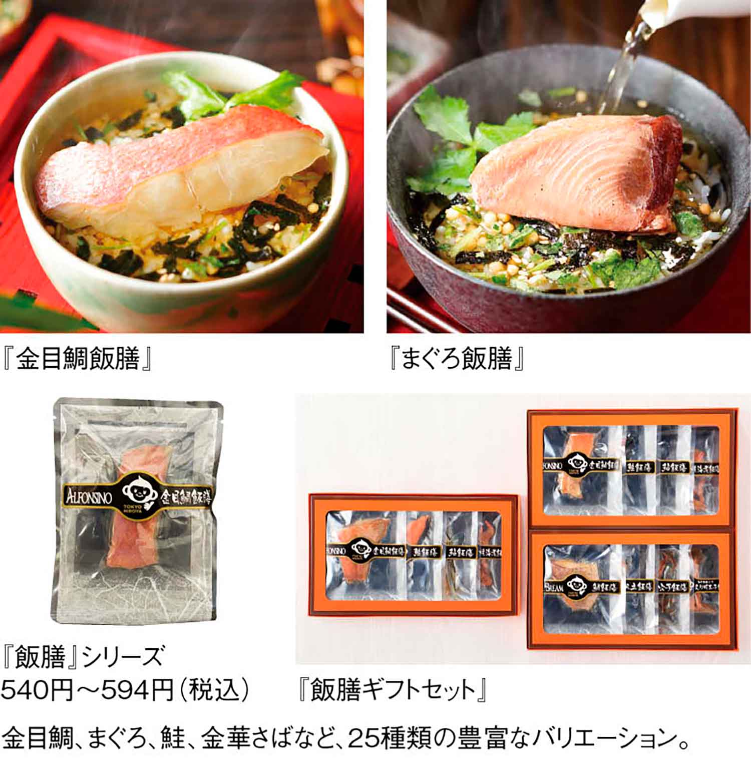 厳選した魚介類を使用したお茶漬が好評の『TOKYOHIROYA -FACTORY』の『飯膳シリーズ』。「専門店や料亭で味わうお茶漬けをご家庭で」というコンセプトで作られたこの商品は、ファーストフードのように手軽で気軽に食べられるよう工夫された本格だし茶漬け。お湯とご飯さえあれば、簡単に自宅や野外で本格的なお茶漬けが味わえる。化学調味料を一切使用せず仕上げたこだわりのだしつゆは、素材のおいしさを引き立たたせた、旨味のある逸品。季節のご挨拶や大切な方への贈り物にぴったり。