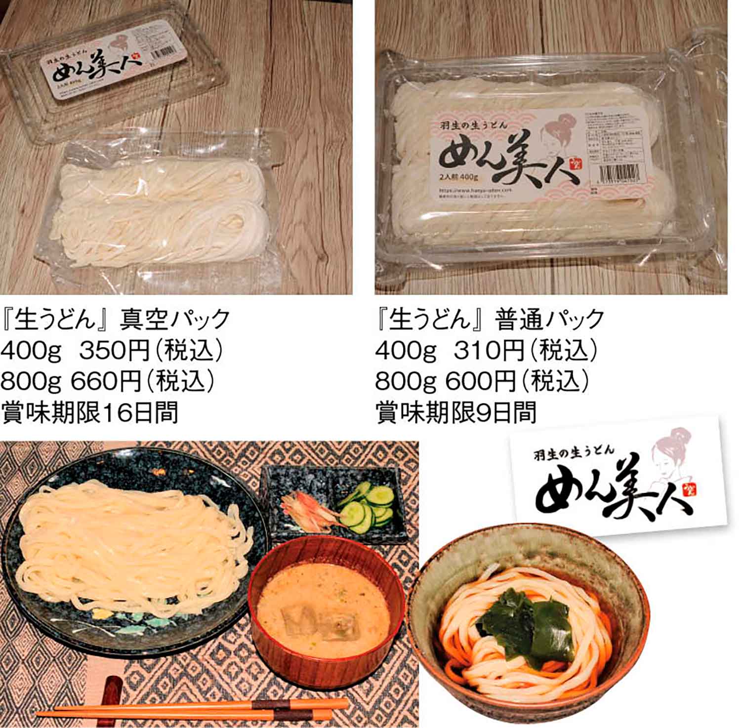 埼玉県羽生市の生うどん製麺所『めん美人』。厳選された小麦粉を使用し、素材本来の風味や甘味が感じられる昔ながらの素朴なうどんを作る。生麺なので、ゆで麺、乾麺とも異なる艶のある輝きと深い味わいが特長。また、口当たりは柔らかでも麺の中心部に弾力があり、熟練職人の技が光る。添加物は不使用。温かくても冷たくても美味しいうどん、長期保存が可能な真空パックもあり、まとめ買いもオススメだ。
