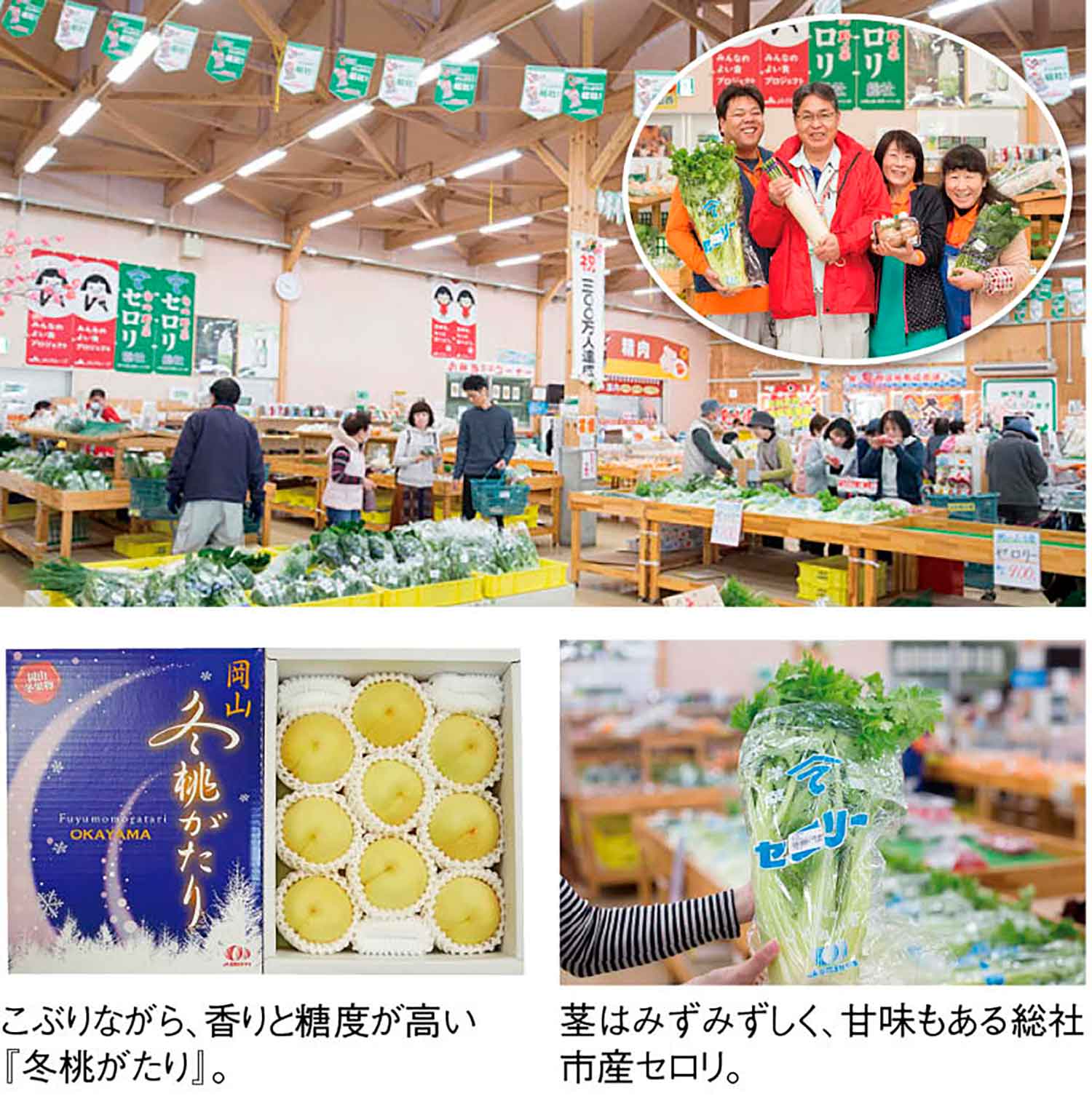 岡山市のお隣、総社市で吉備の歴史を感じさせる備中国分寺。そのシンボルでもある五重塔をのぞむ場所にある『晴れの国岡山農業協同組合』の直売所が『ふれあいの里』。木材を多用し、天井が高く開放感いっぱい店内には、地元の安心・安全な野菜や果物、様々な特産物が並ぶ。特に夏から秋にかけて多くの品種が登場するモモやブドウやクセが少なく食べやすいセロリが人気。寄島魚市場直送の新鮮な瀬戸内海の魚介も販売。