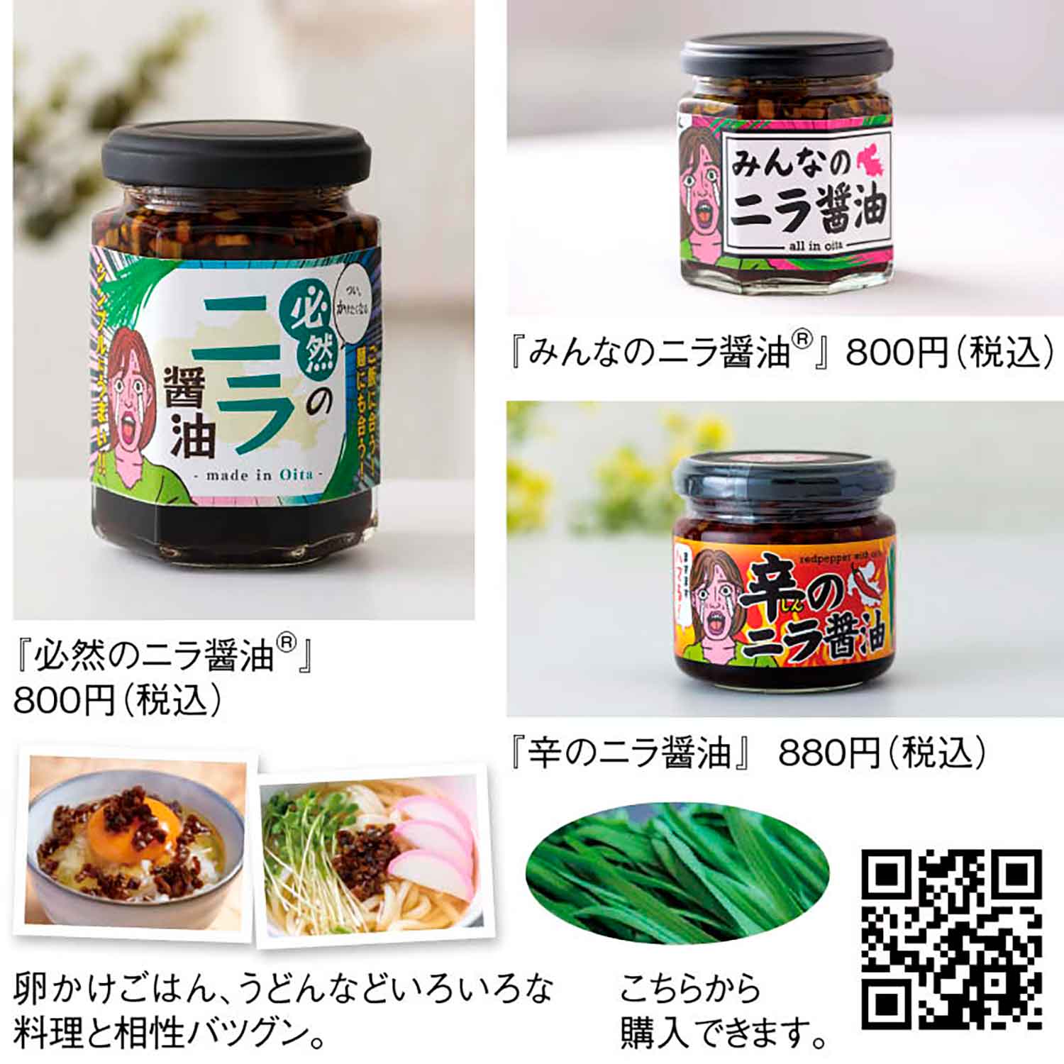 「もったいない」から生まれたメイドイン大分のニラ醤油『必然のニラ醤油Ⓡ』が話題。大分市産のニラを特別に調合した、甘口だし醤油を使った万能調味料で、醤油の風味と絶妙な食感が人気。ごはんやうどん、さらにはパスタなどどんな食べ物とも相性抜群だ。マヨネーズなど他の調味料と混ぜていただくのもオススメ。茎だけでなく葉も入った『みんなのニラ醤油Ⓡ』と辛さを追求した『辛のニラ醤油』も販売中。お買い求めは、公式オンラインショップから。