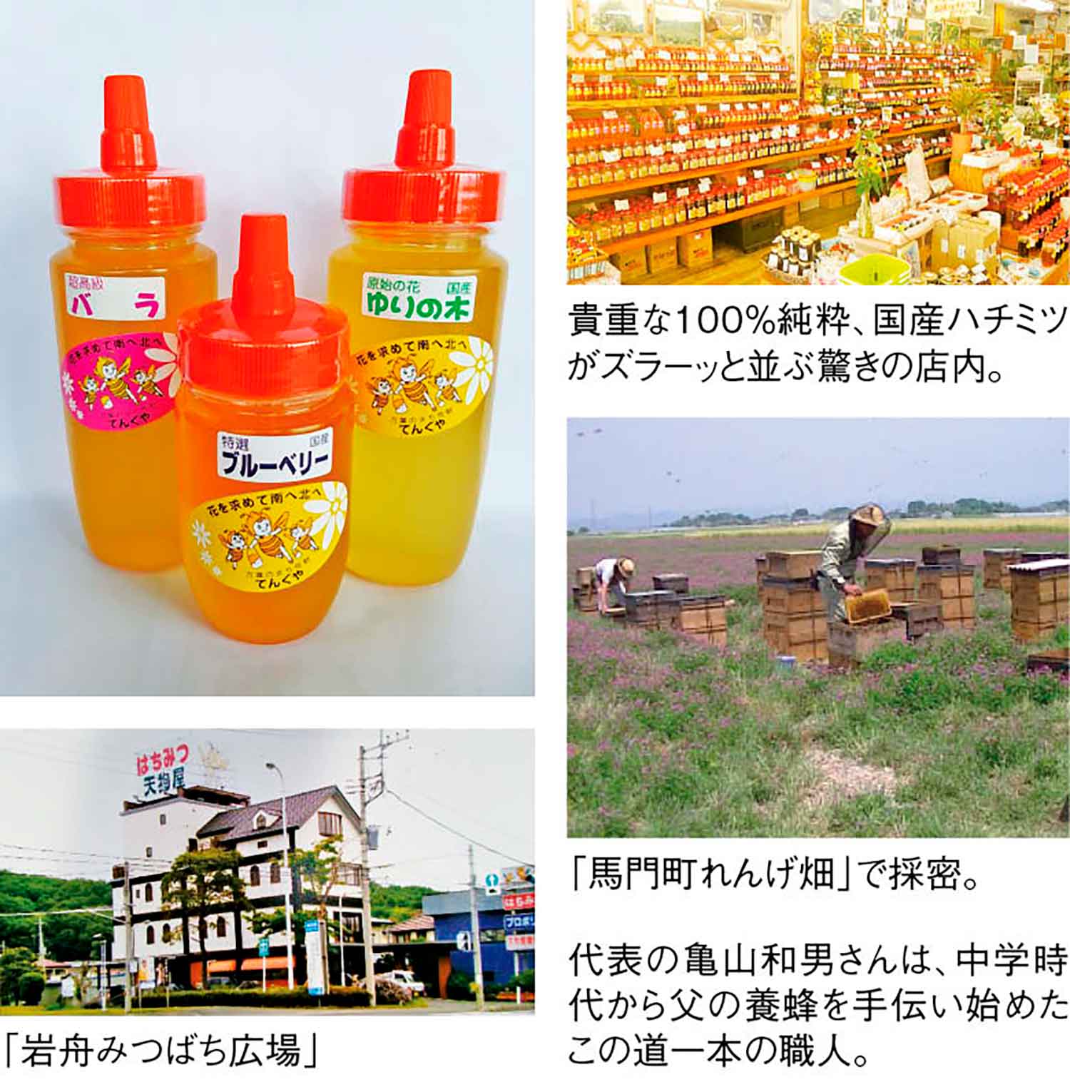 農家とともに菜の花やれんげの花の種をまくところから始める養蜂家。自家採取して、いっさい手を加えることなくそのまま直売。自然のままの味わいは、誰もが違いを実感する。天然の甘さが舌の上に広がるが、口の中にベタつきが残らない爽やかさ。アカシア、バラ、ゆりの木、藤、桜、ブルーベリー、ヒマワリなど店内には国産ハチミツが30種類以上。採ったままをビン詰め、頑固なまでにこだわる超貴重なお店だ。また、ミツバチが採取した樹皮や樹脂成分に分泌物を混ぜて作ったプロポリス『高濃度プロポリス命樹原液』も好評。