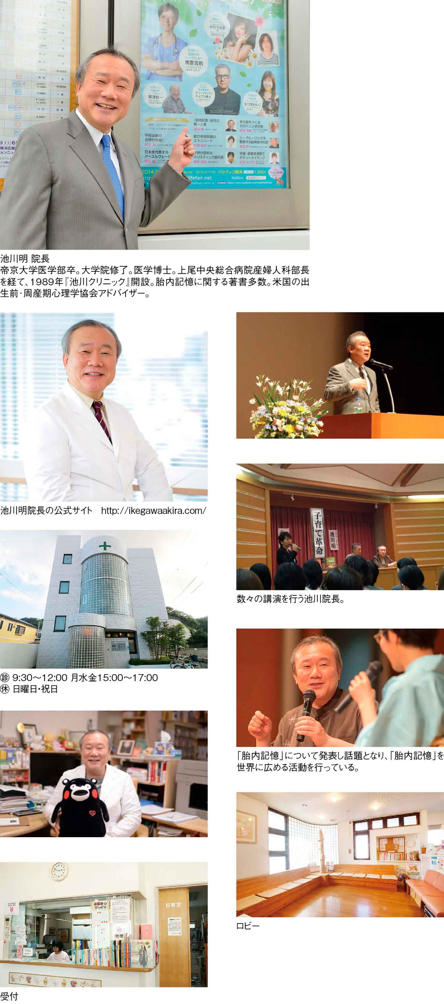 『池川クリニック』の池川明院長は、妊産婦血中ステロイド動態に関する研究で医学博士の学位を取得し、約2700件の分娩を手がけた産婦人科医。今は分娩は行わず、産婦人科・内科、妊娠診断、妊婦健診などに絞って女性の健康管理に力を注いでいるが、その名が世に知られるようになったのは、子どもたちには母親の胎内にいたときの記憶があるとする「胎内記憶」を調査に基づいて発表し、出産前後の子育てに役立てるよう促す啓蒙活動を始めたことだ。その詳しい内容を講演会などで語り、メルマガでも情報を発信している。