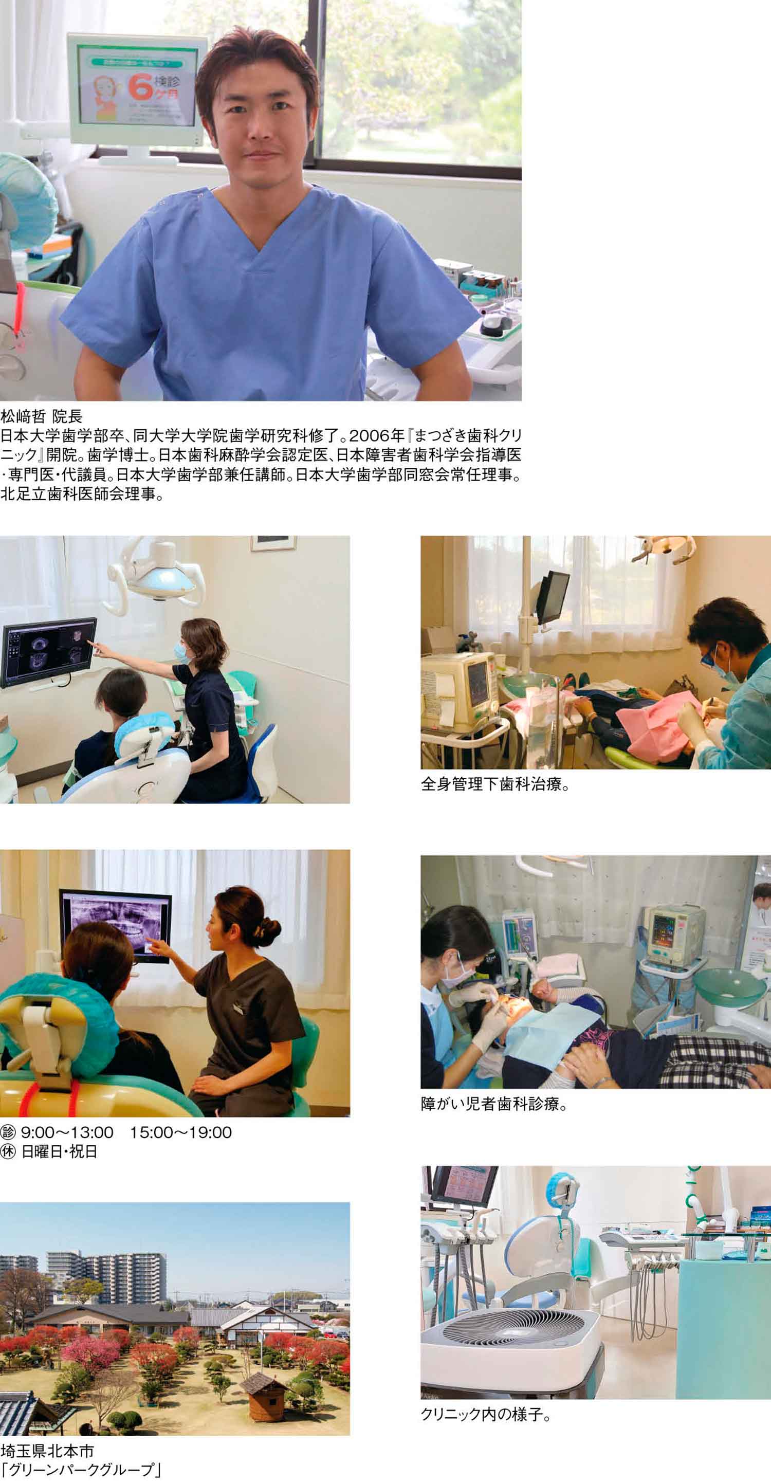 埼玉県北本市で16年の歴史を刻む『まつざき歯科クリニック』の松﨑哲院長は、前脳に存在する神経細胞から分泌される神経伝達物質に関する研究で歯学博士の学位を取得した日本歯科麻酔学会認定医。一般歯科、口腔外科、小児歯科、矯正歯科、審美歯科など幅広い歯科診療で治療実績を重ねるだけでなく、兄で医学博士の剛氏の『まつざき整形リウマチクリニック』、弟で「松﨑商事」社長の眞氏の高齢者・介護施設と全国でも珍しい「医科歯科介護連携」の『グリーンパークグループ』を形成し、高齢化時代の要請である健康寿命の延伸にも力を注ぐ。