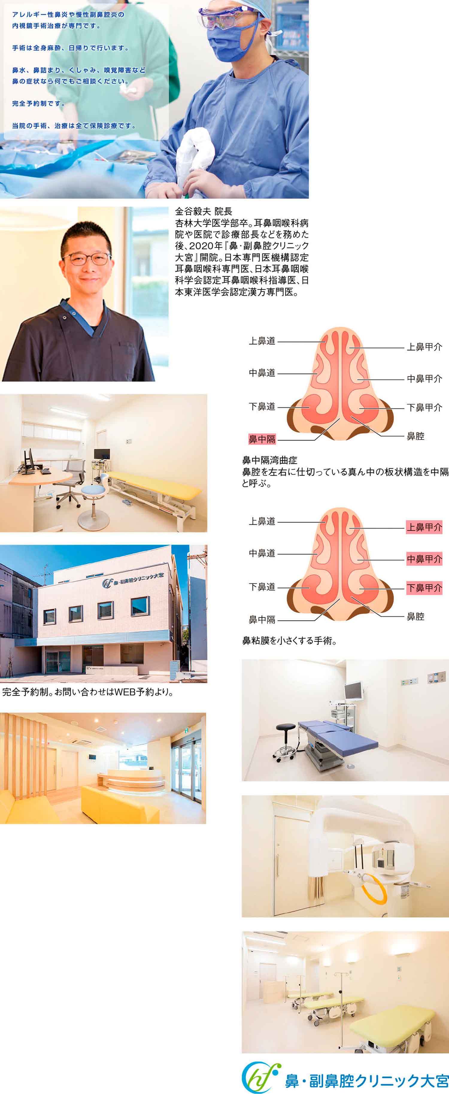 埼玉県さいたま市の『鼻・副鼻腔クリニック大宮』院長の金谷毅夫さんは、臨床研修医時代に鼻の手術で有名な開業医の手術を見学、通常4、5時間かかる手術を約30分で終わらせた技術の高さに驚き、その医師の下で研鑽、さらに病院や医院で手術部門の責任者などを務めながら約5千件の内視鏡手術を経験した後に開院した日本耳鼻咽喉科学会認定耳鼻咽喉科指導医。診療日の午前中を手術に当てているが、西洋医学だけでは限界があるとして取得した漢方専門医の資格も生かした重層的な診療で受診者の生活の質の向上に力を注ぐ。