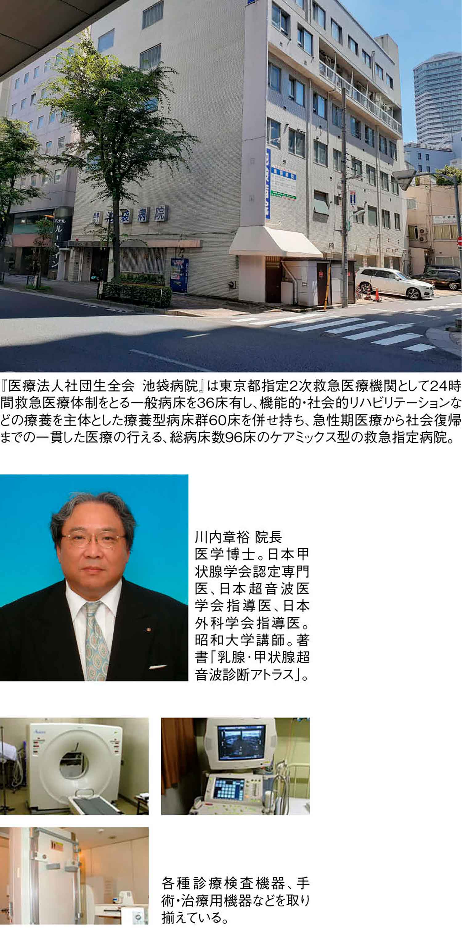 『池袋病院』の川内章裕院長は、乳がん患者の免疫能に関する研究で医学博士の学位を取得、昭和大学外科時代には、びまん性及び結節性甲状腺腫の超音波診断基準を開発した日本超音波医学会指導医。「乳腺・甲状腺外科」では、川内院長がその診断技術を駆使して診察し、甲状腺疾患や乳がんなどの病変を早期発見、治療実績を重ねている。