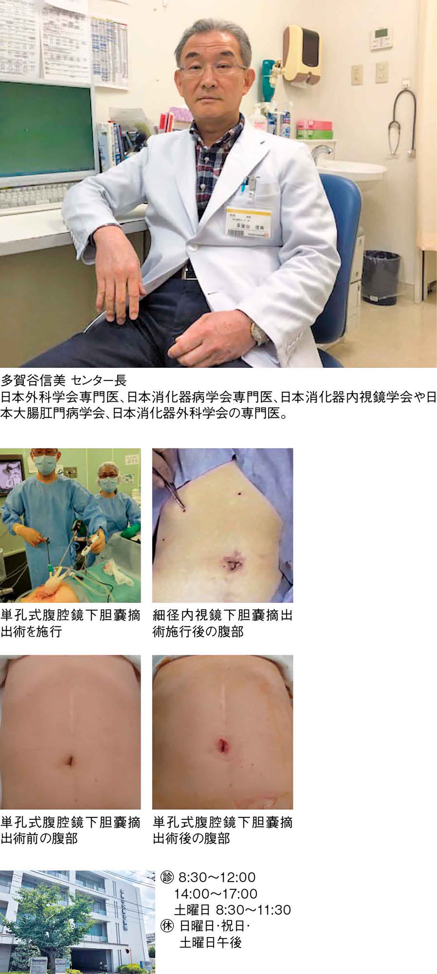 『板橋中央総合病院消化器病センター』の多賀谷信美センター長が胆嚢に石ができる胆石症の治療で行う腹腔鏡下胆嚢摘出術の特長だ。1990年代に腹腔鏡による手術を全国に先駆けて行った日本胆道学会認定指導医。その手術を希望する人が後を絶たず、施行症例実績は都内随一だ。