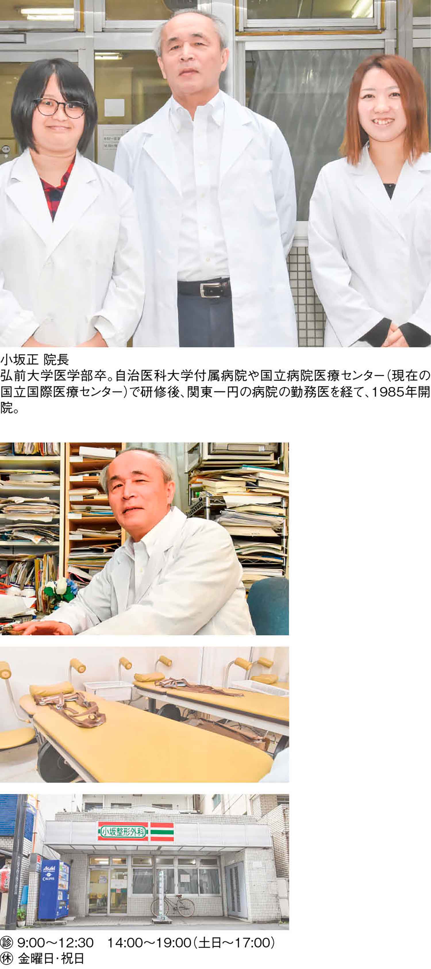 パソコン疲れなど体に痛みを感じたらすぐに治るかかりつけ医として頼りにされているのが『小坂整形外科』だ。整形外科医の小坂正院長は、「這うようにして来た人にも歩いて帰る、10段階で10だった痛みが3、3分の1になる」といい、数多くの手術を施行した勤務医時代の経験や独自の医療技術を駆使して痛みを改善する。