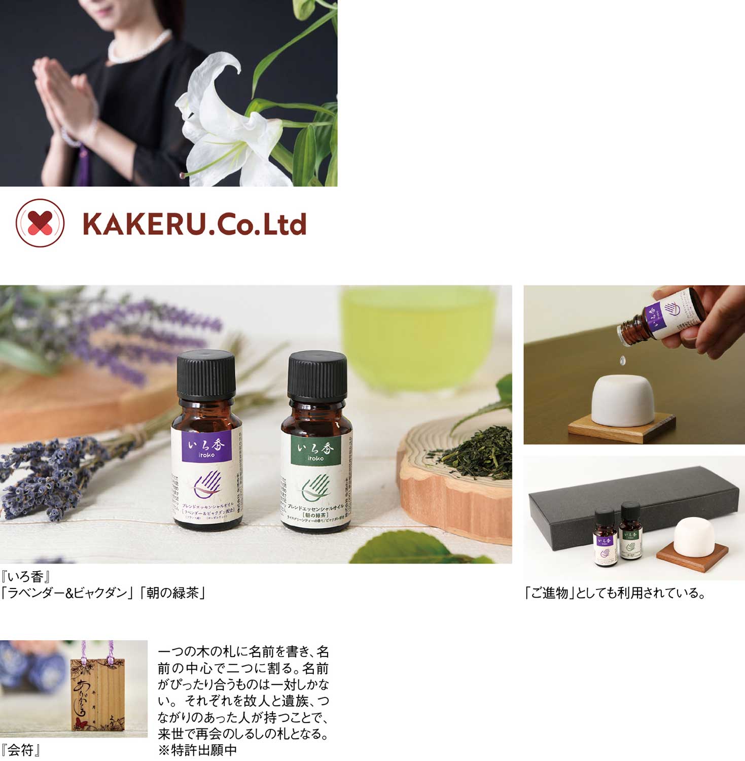 『株式会社カケル』が「生活の木」と共同で開発したオイル『いろ香』は、2種類の香りをラインナップ。「ラベンダー&ビャクダン」は、安眠、安らぎ効果があるといわれているラベンダーの香りで「故人に安眠を」「遺族に安らぎを」という想い。「朝の緑茶」は、 生前に最も食したであろう食べ物「炊き立てご飯」と「お茶」を香りにしたものだ。