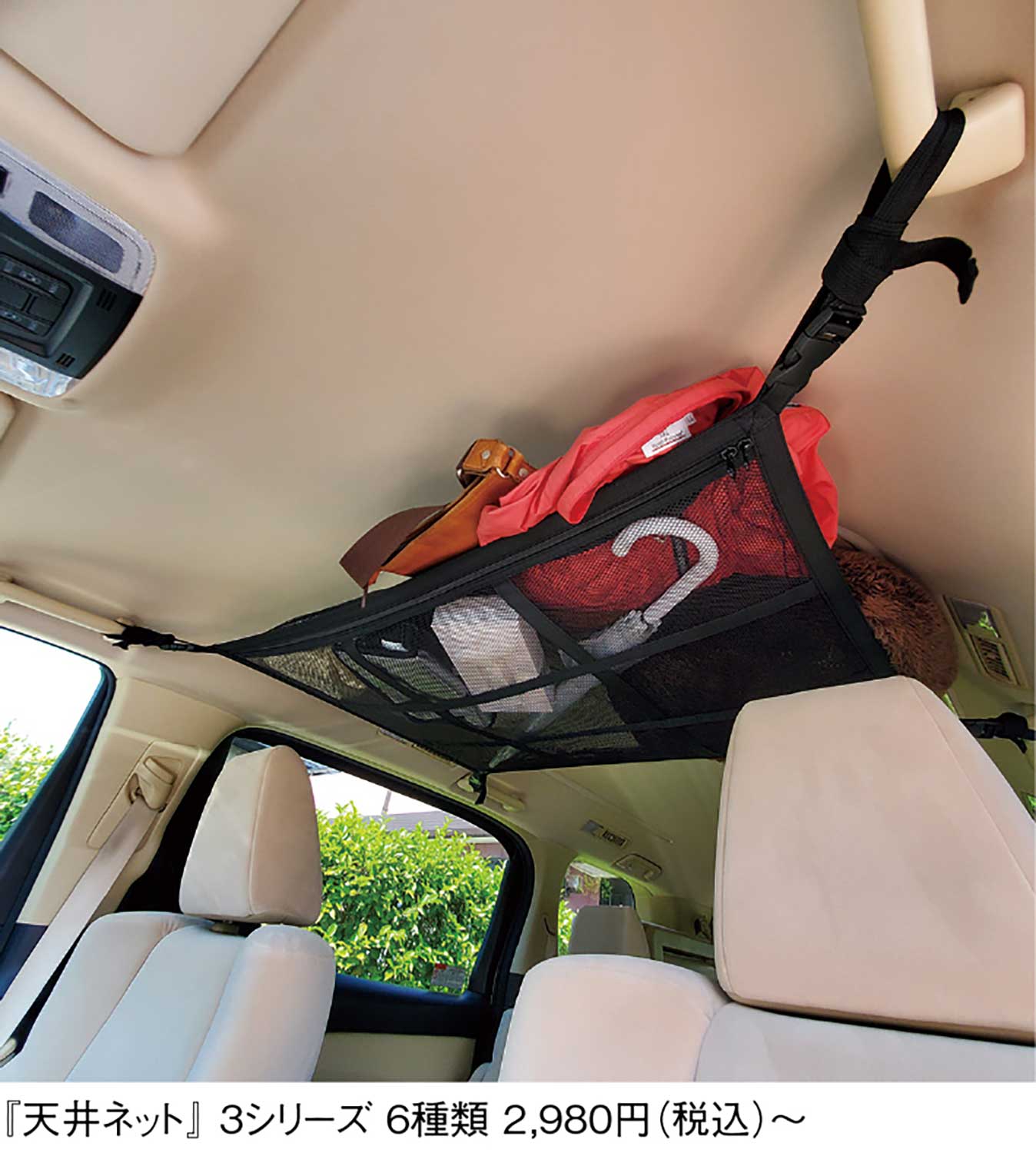 『MK&JAMT』が開発したレジャーや車中泊に大活躍する『天井ネット』は、たっぷり収納の高さ6㎝の立体ネット。両サイドのファスナーで前席、後席のどちらからでも荷物が取り出せる。垂れにくいので後方の視界を確保できる。より快適になった「ティッシュホルダー付」は、どの厚さのティッシュBOXでも簡単取付。釣りファン待望の「ロッドキャリー付き」は、従来品より面積を20%拡大した大型ネット。釣竿や長尺なものを取り付けできる。