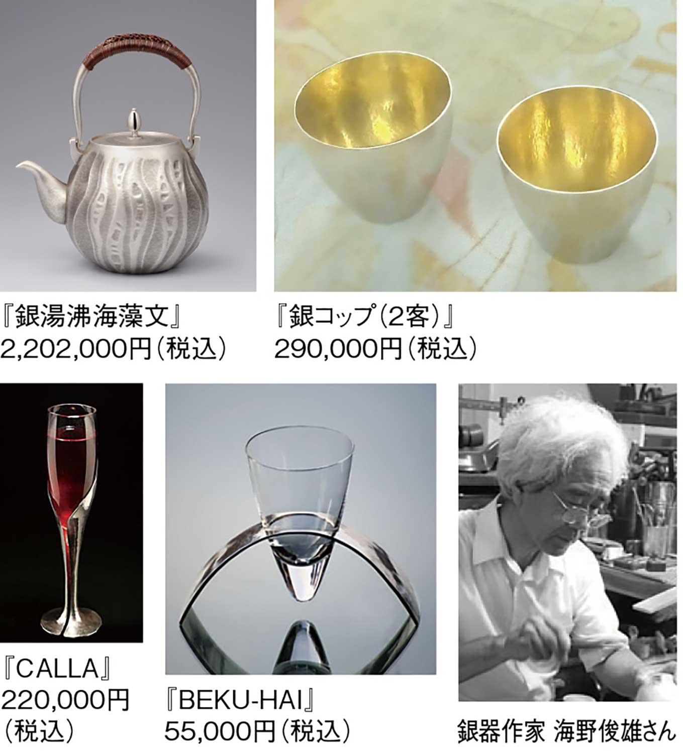 江戸の昔より日用品や武具、仏具など多彩な銀製品を優れた技術で作り上げてきた「銀師(しろがねし)」。海野雲雄氏も数々の伝統的銀製品を仕事とし、現代の「銀師」と称される。そんな同氏がプロダクトデザイナーである平瀬尋士氏とコラボ。ガラスと銀を融合させたスタイリッシュな銀器を生み出している。和洋問わず暮らしの中に溶け込み、ワンランク上のアクセントを与えるそのデザインは未来的ともいえよう(ライター/今井淳二)