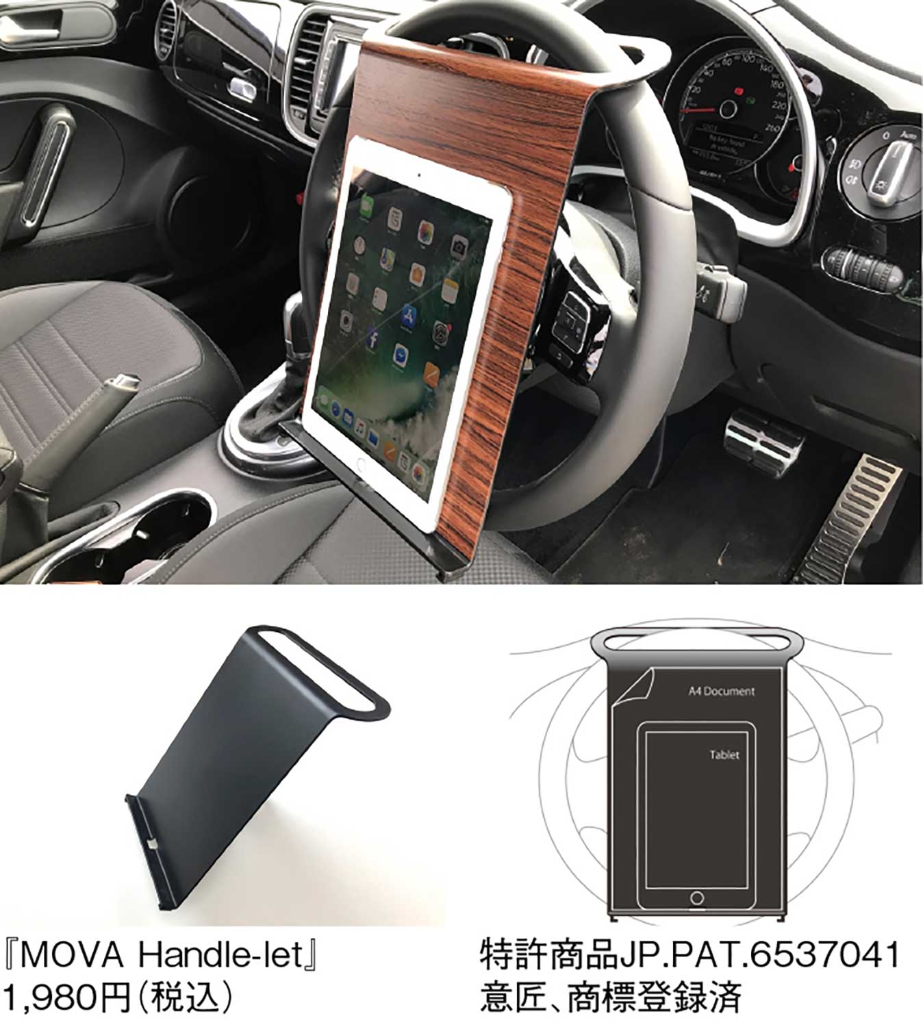 コロナ禍や働き方改革により一般化したテレワーク。自宅やカフェなどの他、営業車など自動車内でのすきま時間に狭い車内で事務仕事をこなすことも。『昌和プラスチック工業株式会社』の『MOVA(もーば)Handle-let ハンドレット』は、駐車中の車のハンドルにかけるだけで、A4書類の書き込みやタブレットの視聴が楽な姿勢でできる。薄型なので使用しない時はシート背面やドアポケットに収納しておける。カラーは黒と木目を用意。