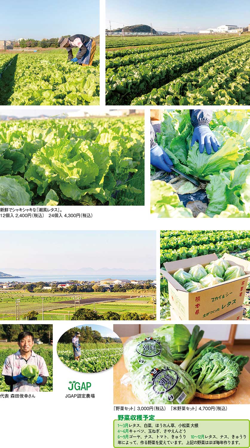 サラダ、炒め物、鍋物、スープなどに利用される「玉レタス」。各地で栽培されているが、特性が際立って優れていると好評なのが、熊本県天草地方特有の温暖な気候と恵まれた土壌、海から吹き付けるさわやかな潮風を受けて育った『森田農園』代表の森田俊幸さんが手塩をかけて栽培し、ブランド化した『潮風レタス』だ。自然の力を最大限に利用しながら、ミネラルとカルシウムなどが配合された肥料を使い、栄養豊富な土づくりにこだわっている。四方を海に囲まれた地域なので、潮風が吹き込み、野菜の味や風味を引き出してくれるという。減農薬栽培にもこだわり、最小限に抑えて使用することで、作物への農薬残留のリスクが軽減し、安心して食べることが可能だ。減農薬は、土壌生物のバランスを保ちながら作物を育てることができるので、土の品質も保つことができて一段とおいしいレタスがそだつ。