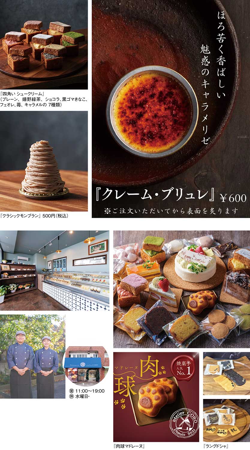 2021年、佐賀県佐賀市にオープンした『atelier CORO』は、創業当初から受け継がれる伝統製法と厳選した食材で丁寧に焼き上げたお菓子が人気の洋菓子工房だ。焼き菓子の看板商品である『肉球マドレーヌ』やユニークな見た目の『四角いシュークリーム』などが話題を呼び、県外からも多くのファンが訪れる。生菓子のラインナップも豊富で、特に『クリーム・ブリュレ』は、注文を受けてからお客様の目の前で表面を炙り、キャラメリゼして仕上げる人気商品だ。鮮度にこだわり、賞味期限はわずか1時間。その分、香ばしい香りとパリッとした表面、そしてとろけるようなクリームの濃厚な味わいが絶妙で、一度食べたら虜になること間違いなし。スプーンで表面を割る瞬間の高揚感とともに、心ほどけるような至福のひとときを楽しめる。フレーバーは定番のバニラと月替わりの2種類が用意されており、訪れるたびに違った味に出会えるのも魅力の一つだ。