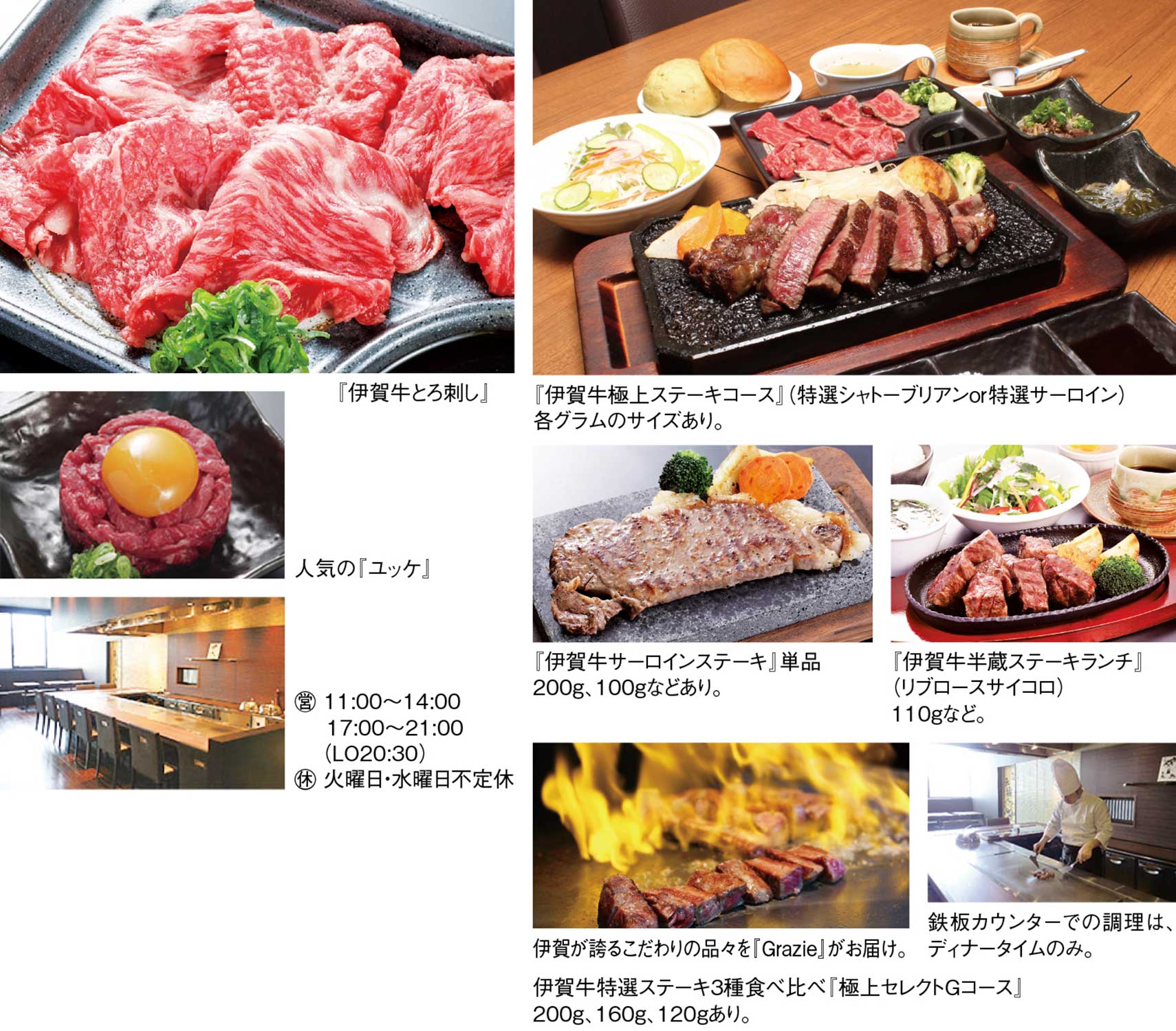 人気は部位の違う3種の特選ステーキをおまかせで食べ比べできる『極上セレクトGコース』。量も価格もお得になっている。他にも貴重なシャトーブリアン、柔らかなサーロイン、旨味たっぷりの赤身などの各『伊賀牛極上ステーキコース』も。さらに手軽にいただけるステーキランチやハンバーグなどもオススメ。