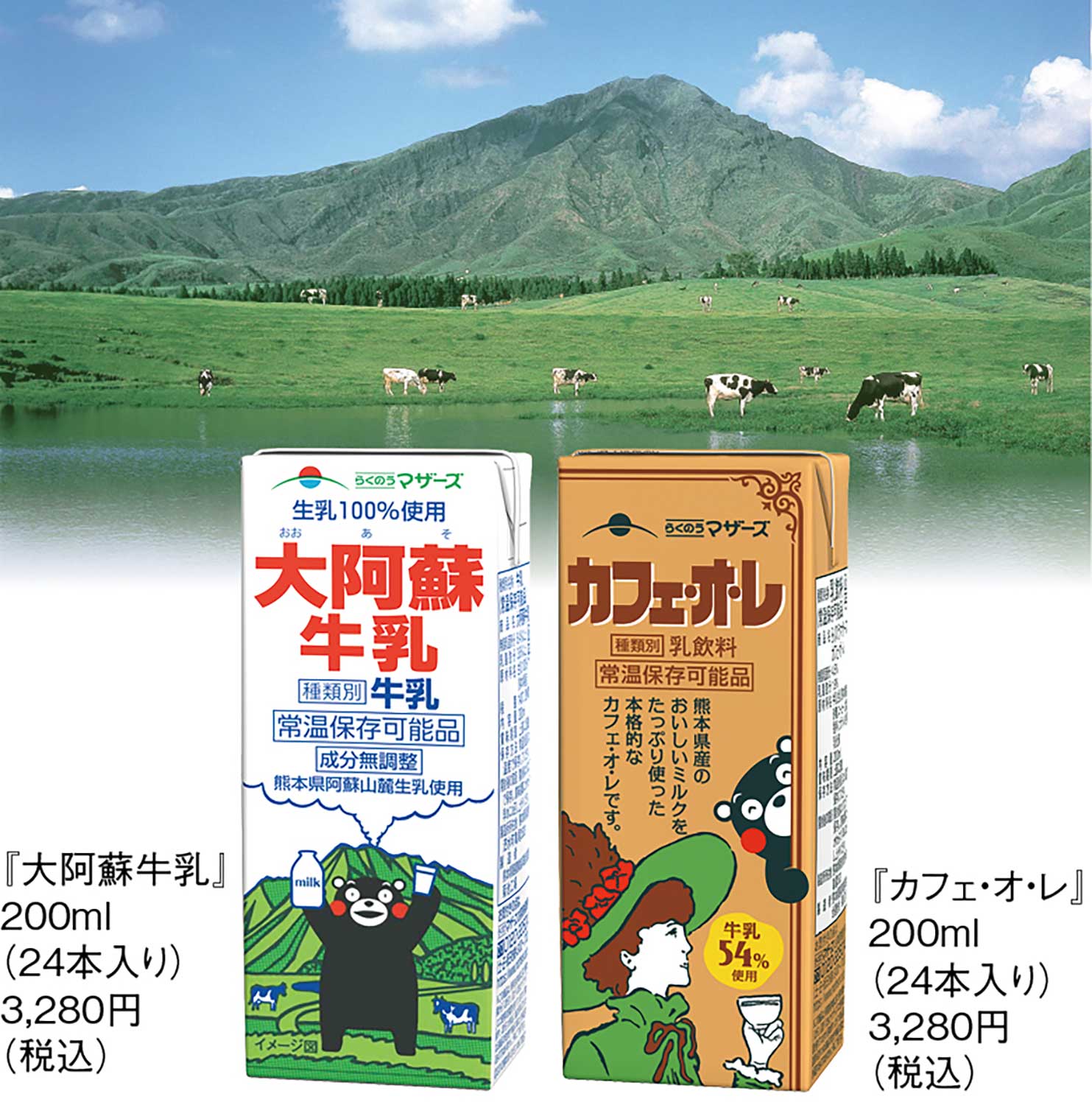 殺菌方法と容器を工夫し、常温でも90日の保存を可能にした成分無調整牛乳が、『らくのうマザーズ』の『大阿蘇牛乳』だ。熊本県は、生乳生産量が全国3位。西日本随一の酪農地帯、熊本県阿蘇山麓産の新鮮な生乳を100%使用し、衛生的な工場で殺菌後無菌パック。日常的に飲用しながら常備しておけば、いざという時にも備えられ、バランスのとれた栄養を取ることができる。また、阿蘇山麓産の牛乳54%使用したロングセラーの本格派『カフェ・オ・レ』もぜひ。