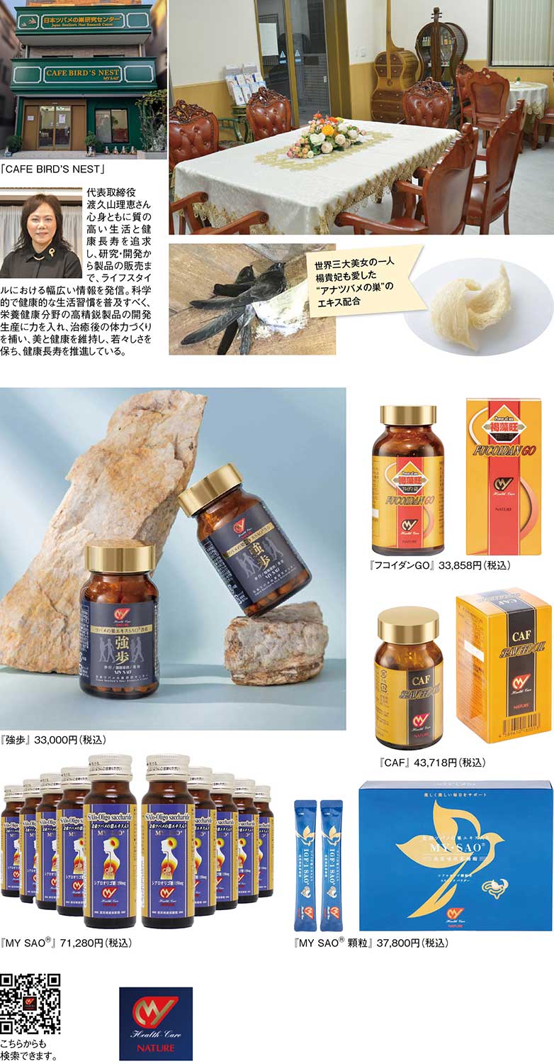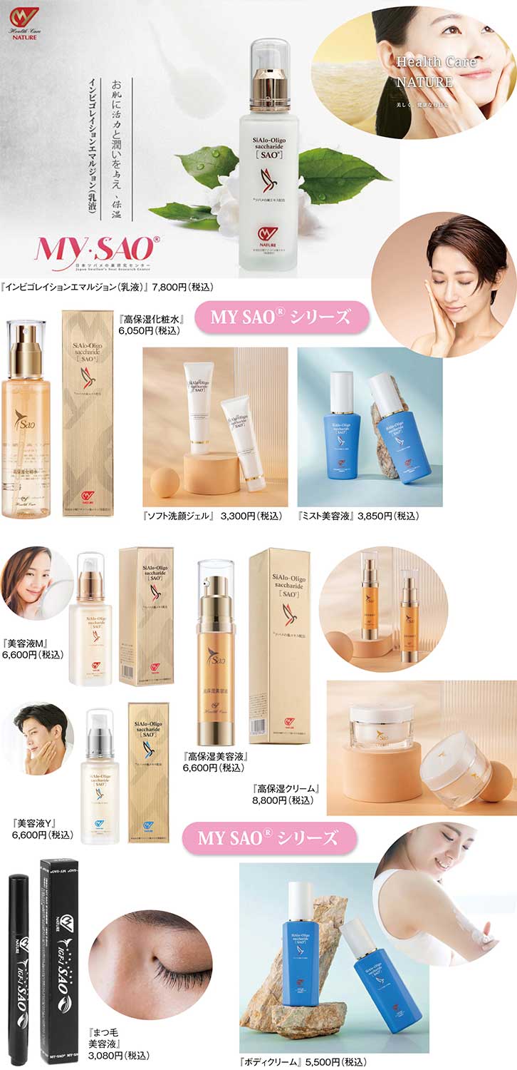 同社は、独自の特許技術でアナツバメの巣から、母乳にも存在し栄養価が高いNANA型シアル酸を含む、非常に貴重なシアロオリゴ糖(SAOⓇ)を抽出することに成功。この希少なシアロオリゴ糖(SAOⓇ)を活かし、人々の健康、美容にもたらす健康食品や化粧品を手がける。『MY・SAOⓇ』シリーズは、年齢を重ねた身体の美しく健やかな毎日を内側からサポートするドリンクだ。携帯に便利な顆粒タイプも用意されており、好みやライフスタイルにあわせて摂取できる。さらに、シアロオリゴ糖(SAOⓇ)をはじめ、特許成分マグジサリシレートやE型コンドロイチン、フコイダンなど12成分を配合した『強歩』は、日々のコンディション維持に着目したサプリメントだ。フルーティーな味わいで続けやすく、軽やかな毎日をサポートする。そのほかにも『CAF』『フコイダンGO』など、日々の健やかな質の高い生活を支える製品が揃う。