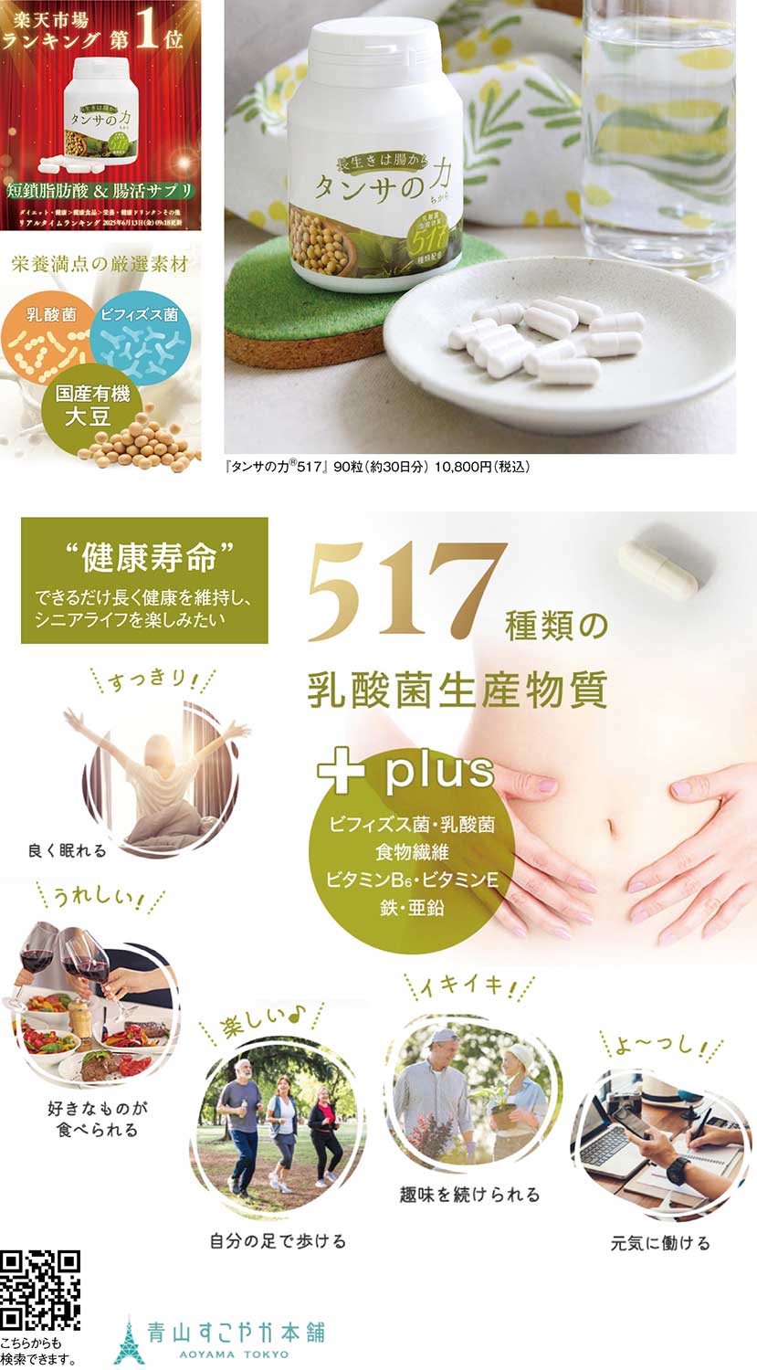 『株式会社青山すこやか本舗』の『タンサの力Ⓡ517』と『魔法のTANSAⓇ409』は、人生100年時代となった健康寿命を支えてくれるサプリメントだ。