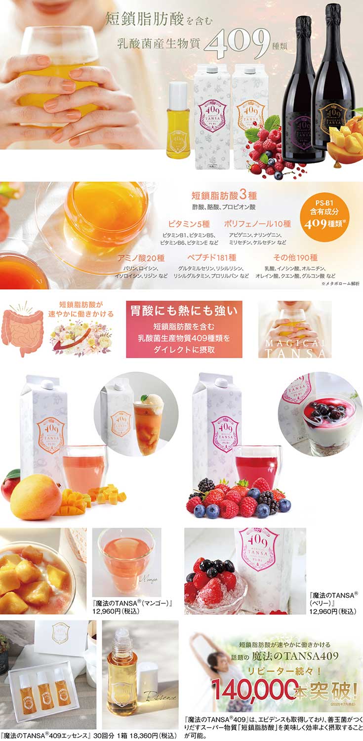 『魔法のTANSAⓇ409』は、短鎖脂肪酸を含む乳酸菌生産物質409種類を配合したドリンクタイプのサプリメント。腸内環境の個人差に左右されにくく、胃酸にも熱にも強いなど、短鎖脂肪酸を含む乳酸菌生産物質を手軽に取り入れられるよう設計されている。味は、甘すぎずスッキリした「マンゴー」とフルーティーな「ベリー」の2種がラインナップ。水や炭酸、お湯で割って楽しんだり、ヨーグルトやスムージー、紅茶、アイスクリームなどに加えてアレンジするのもオススメ。また、原液100%の『魔法のTANSAⓇ409エッセンス』も用意。わずかな酸味しかなく、コーヒーやみそ汁、スープなどに混ぜて摂取できるので、日々の食事の中でも無理なく続けられる。