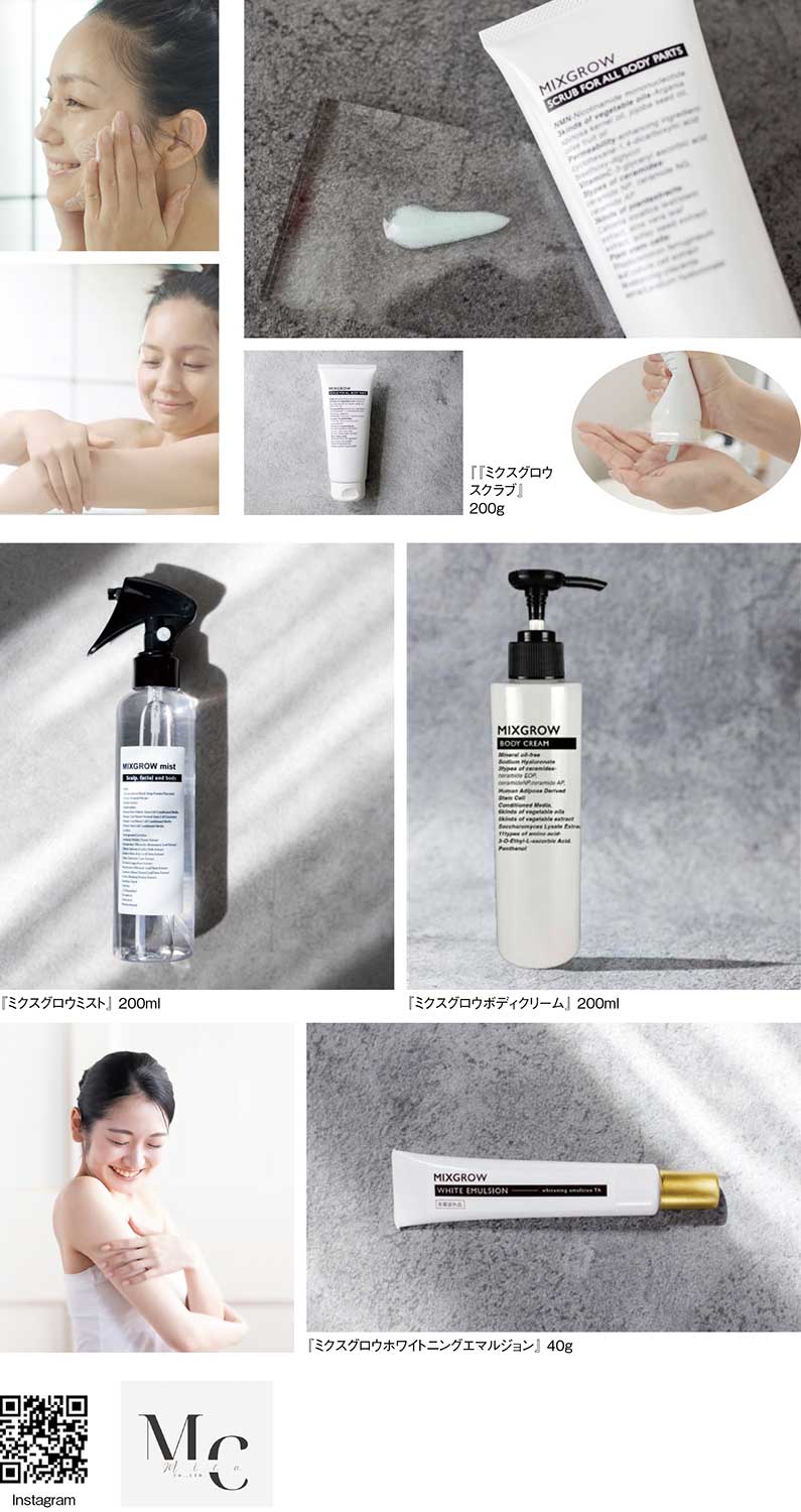 「男女ともに輝く」をコンセプトに、スキンケアだけでなくヘアや頭皮にもマルチに活躍する『ミクスグロウシリーズ』。『ミクスグロウスクラブ』は、オイルコーティングされたNMNを中心に、植物幹細胞、ヒアルロン酸、プラセンタエキス、アルガニアオイルなどを配合したシュガースクラブだ。濡れた肌に適量を伸ばすとシュガー粒子が溶けてやさしい感触へと変化し、古い角質を取り除いてなめらかな肌へと導く。保湿美容成分が角質層までしっかり届き、うるおいを与えながら肌のキメを整えてくれる。『ミクスグロウミスト』は、ヒト幹細胞順化培養液と臍帯血エクソソーム、毛根幹細胞などを贅沢に配合した美容液ミスト。頭皮のコンディションを整え、すこやかな毛髪環境へとサポートする。さらに肌のゆらぎを整え、うるおいを保ったすこやかな地肌に整える。シャンプー後や洗顔後、頭皮や顔、全身の気になる部分にたっぷりとスプレーするだけの簡単ケアなので続けやすい。2025年5月発売の『ミクスグロウボディクリーム』は、インバスとアウトバスの両方に使用できるマルチタイプのボディクリーム。ヒト幹細胞エキスや水溶性ビタミンC誘導体、パンテノール、3種のセラミド、6種の植物オイルなどを贅沢に配合し、濡れた肌にもすっとなじみ、うるおいのあるやわらかな肌へと導く。『ミクスグロウホワイトニングエマルジョン』は、美白有効成分トラネキサム酸と抗炎症成分グリチルリチン酸ステアリルをW配合した医薬部外品の美白乳液。乾燥による肌荒れを防ぎ、透明感ある肌印象をサポート。デリケートな部位にも使えるやさしい処方で、わきやVIOなど黒ずみが気になる部位のケアにもピッタリだ。肌の状態に合わせて単品でも使用できるが、角質ケア、うるおい補給、保湿、透明感ケアとステップごとに効果が異なるため、ライン使いがオススメ。毎日のケアでうるおいや艶のある肌をめざし、美とすこやかさをサポートしてくれる。