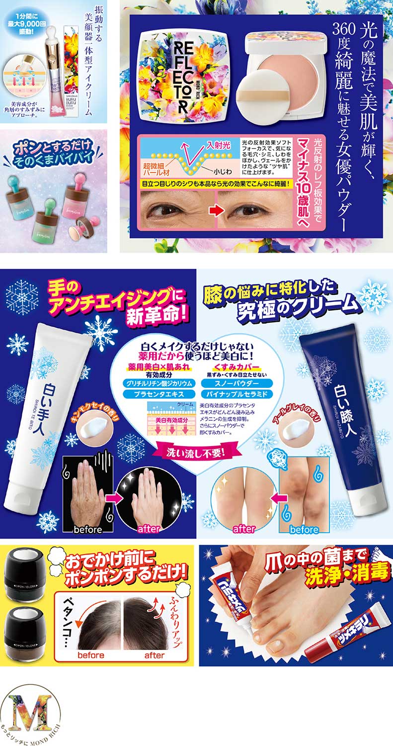 「もっとリッチにモントリッチ」をコンセプトに「美と笑顔」をテーマに発信している『株式会社モント・リッチ』。日本初の可愛い韓国容器の『バイバイくまーたんクマ撃退コンシーラー』が人気だ。青クマ・茶クマ・黒クマたんにそれぞれ対応する美容成分がたっぷり。気になるクマを隠ししっかりケア。その他日常に笑顔になるアイテムがたくさん。『女優パウダーリフレクターFL』は、光を味方にする微細パール入りのファンデーションで自然な艶と立体感を演出。レフ板効果でシワやほうれい線が目立たなくなり、まるで女優のような美しく艶やかな肌へに見せてくれる。『白玉ぷるぷるアイクリーム』は、印象を決める目もとにアプローチする美顔器一体型のアイクリーム。グルタチオン配合で、透明感とハリ感を叶えてくれる。冷たいセラミックヘッドの微振動で成分が角質層まで浸透し、白玉のような印象のふっくらした目もとに。『薬用白い手人』は、手の甲やしみにアプローチする美白ハンドクリームだ。美白有効成分のプラセンタエキスがメラニンの生成を抑え、しみやそばかすを防ぐ。また、肌荒れ有効成分のグリチルリチン酸ジカリウムが皮膚に潤いを与え、乾燥を防ぐ。酸化チタン入りのスノーパウダーが、気になるくすみを飛ばし、明るい肌を演出してくれる。『薬用白い膝人』は、膝のくすみやガサガサが気になる方に向けた美白クリームだ。美白有効成分プラセンタエキスと肌荒れ有効成分グリチルリチン酸ジカリウム配合により、メラニンの生成を抑え、皮膚に潤いを与えて乾燥を防ぐ。植物性セラミドやスノーパウダーがなめらかな質感と澄んだ印象を与えるので、塗るだけで品よく仕上がるのが嬉しい。『薬用ツメキラリ』は、爪にとどまる薬用ジェルに含まれる有効成分ベンザルコニウム塩化物が爪周りの原因菌を洗浄。一日2回の簡単ケアで透明感のある清潔感のある爪へと整える。『ポンポン頭皮ファンデーション』は、パフタイプのファンデーションを気になる分け目やつむじなどにポンポンと乗せるだけで、簡単にカバーできる優れもの。リッチで楽しいアイテムたちが、忙しい日々のなかでも自分磨きを特別なものへと変えてくれる。