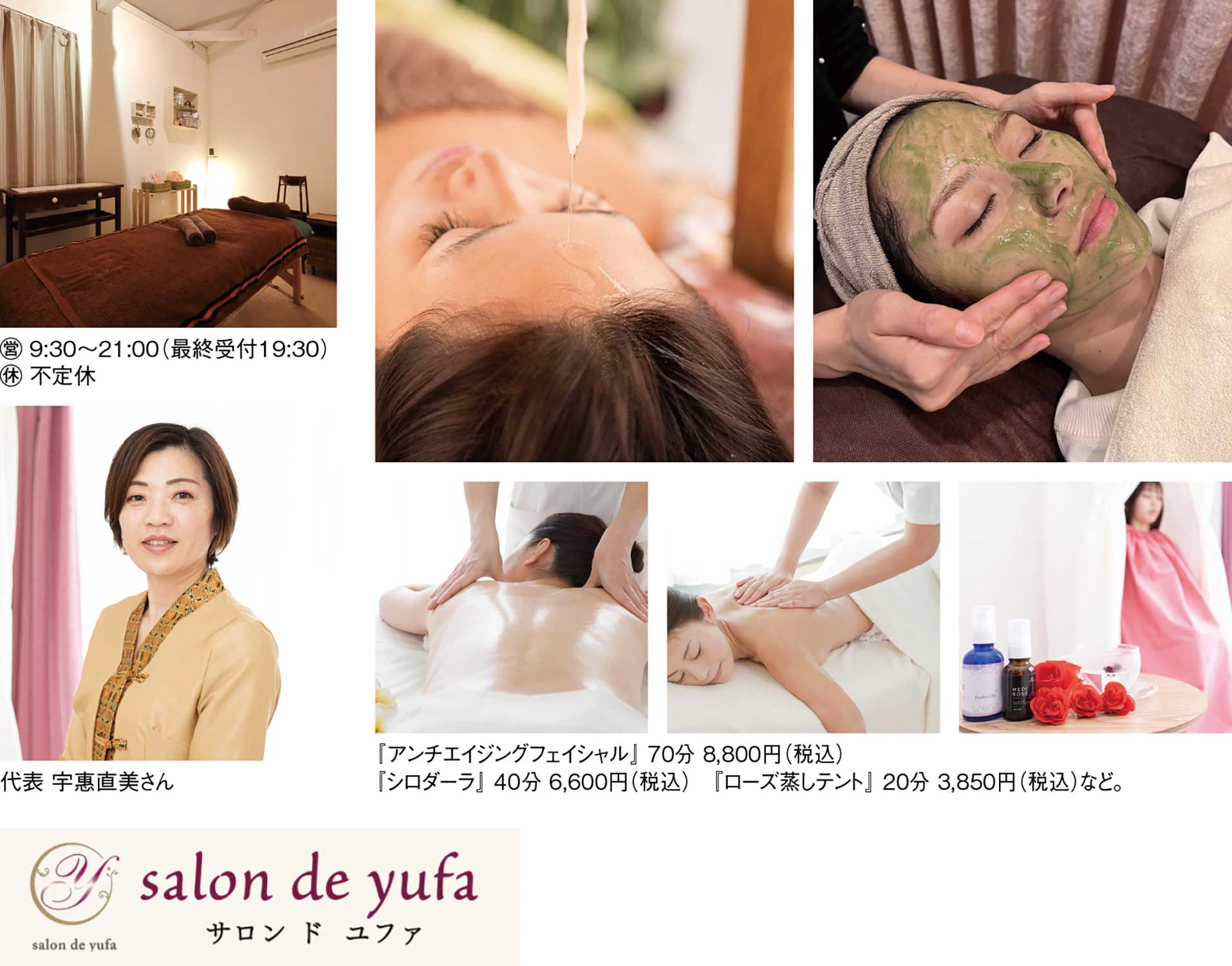 2025年、千葉県木更津市にオープンした『Salon de Yufa』は、アーユルヴェーダの叡智をもとに、病気になる前の未病ケアを重視したエステサロン。心身を深いリラクゼーションへと導くシロダーラや完全無農薬のローズオイルを贅沢に使ったオイルトリートメント、ローズテント蒸しなど、一人ひとりの体調や体質に寄り添ったオーダーメイドケアを受けられる。近年、増加傾向にある生活習慣病や認知症、さらにはコロナワクチン接種後の体調不良などの悩みにもアーユルヴェーダの視点から未病ケアや日常生活のアドバイスを提案。セルフケアや生活習慣の見直しを通して、不調をためこまない毎日へと導く。今後は、新たに「体質診断」などのメニューもスタート予定。地域で唯一、フェムケアトリートメント(デリケートゾーン、バストケア、中医学フェムケア耳ツボ)を取り入れ、より深い女性の体調の変化に寄り添って根本解決を目指してアドバイスしている。日々学びを深めながら、お客様一人ひとりの身体に真摯に向き合い、心身共に健やかな身体を取り戻せるよう寄り添っていく。